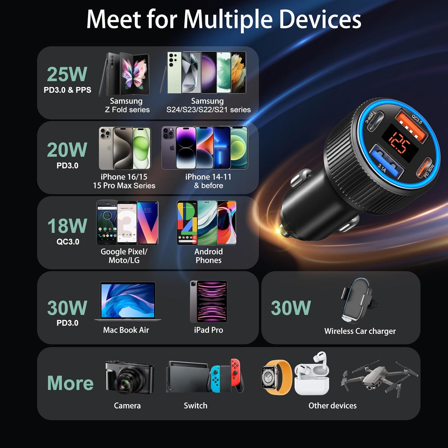 - [Wide Compatible] Wide range from dc 12V-24V(6A), the 12 volt usb c car charger outlet works great with smart phones, tablets, car charger mount, dash cams, usb fans and other usbc and usb car accessories. Fast charge compatible with iPhone 16/15/14/13/12/11 Pro Max/Plus/Mimi; Pad Pro/Mini; iPhone XR/SE/XR/Xs/Xs Max/8/7 Plus,Galaxy S24/S23/S22/21/S20/S10/S9/S8+,Note 20/10/9/8, A03S 5G/A13/A14/A15/A53/A54/A71; Motor, L G phones, driving recorder, GPS navigation, car vacuum cleaner, power banks and other devices.