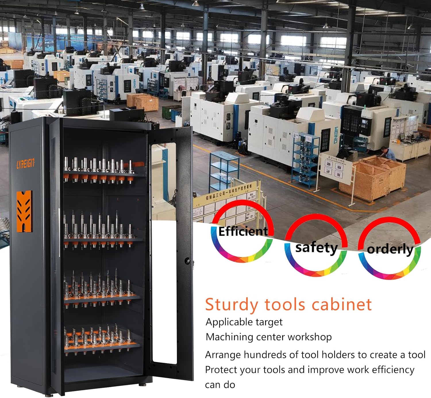 - PERFECT DESIGN: LYREIGN CNC tool holder is specially designed for CNC machinists and workers. The design drawing pocket is installed on the side of the cabinet to place documents, and the widening handle is convenient for opening the door. The lockable door is safe and anti-lost, and the Transparent acrylic windows clearly visible. Tool holder Cabinet can accommodate 120 pieces of CAT40 tools and can bear a weight of 1200kg. Model: CAT40/BT40-120CAP. Size: 33.4"L x 21.6"W x 72"H.