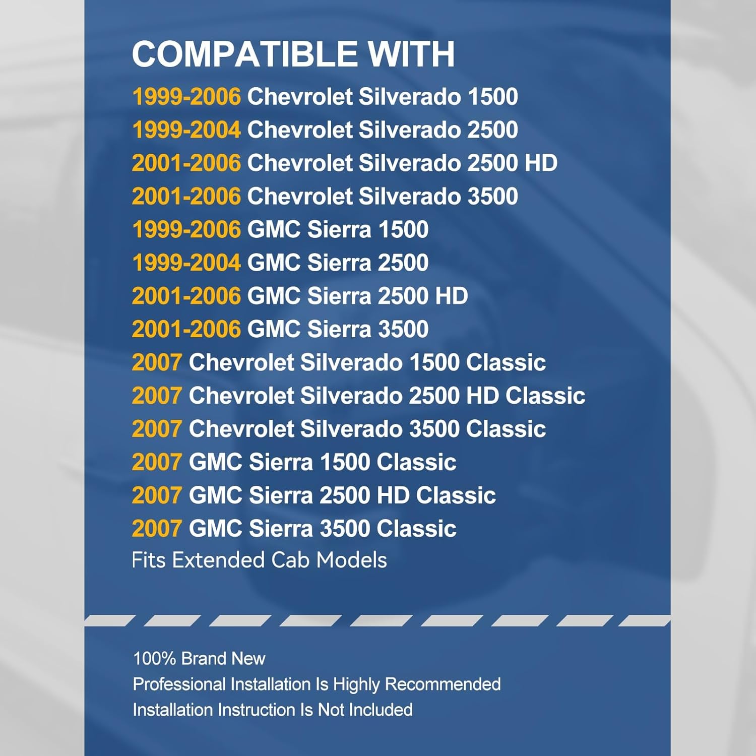 - Vehicle Compatibility - Compatible with Chevy Silverado 1500 2500 HD 3500 1999-2006, Chevy Silverado 1500 2500 HD 3500 Classic 2007, GMC Sierra 1500 2500 HD 3500 1999-2006, GMC Sierra 1500 2500 HD 3500 Classic 2007, Fits Extended Cab Models.