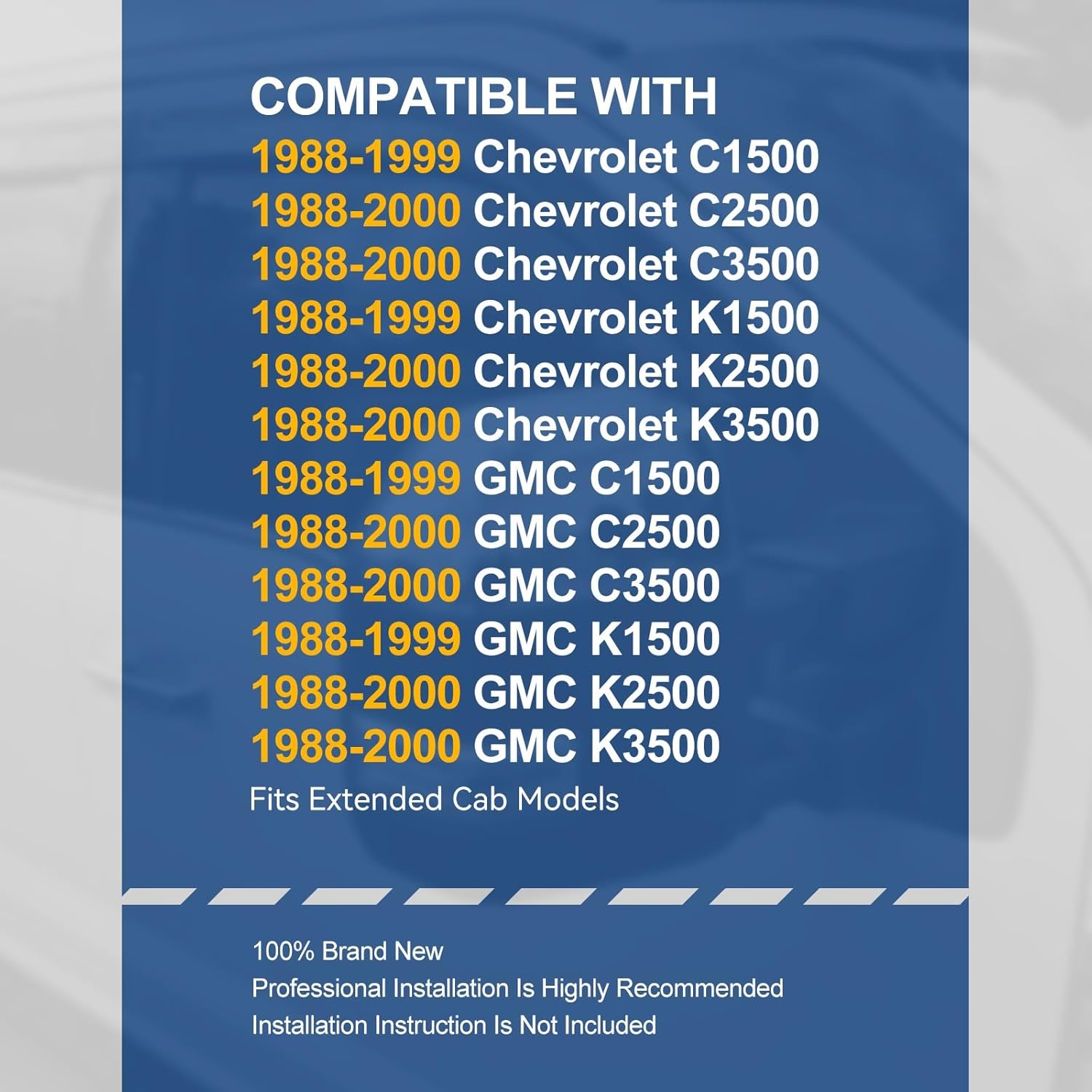 - Vehicle Compatibility - Window Visors Compatible with Chevrolet C1500 C2500 C3500 K1500 K2500 K3500 1988-2000, GMC C1500 C2500 C3500 K1500 K2500 K3500 1988-2000, Fits Extended Cab Models.