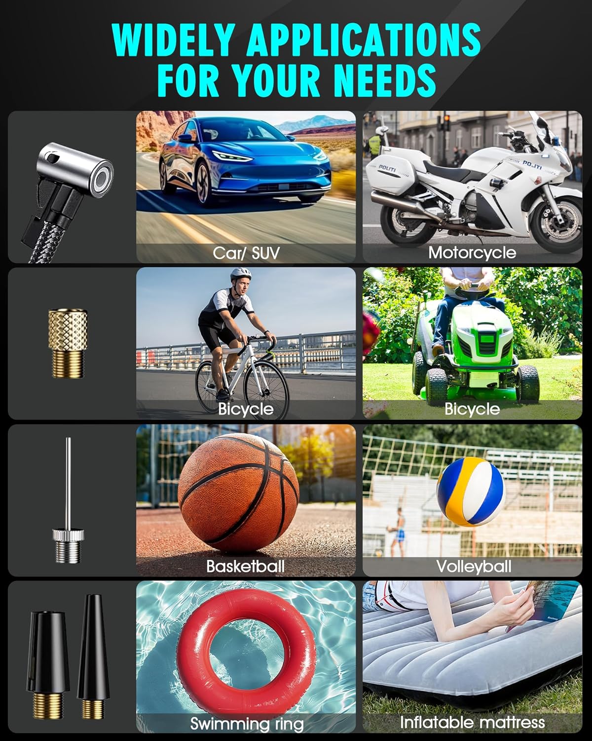 - COMPACT & PORTABLE:The tire pump is lightweight and compact, making it easy to carry and store. Its size strikes the ideal balance between portability and functionality, allowing you to take it anywhere. Whether you keep it in a backpack, attach it to your bike, or store it in your car, it's hassle-free. This makes it perfect for emergencies, outdoor activities, and camping trips. With this pump, you have the perfect size and power, eliminating the need for frequent trips to fill your tires.