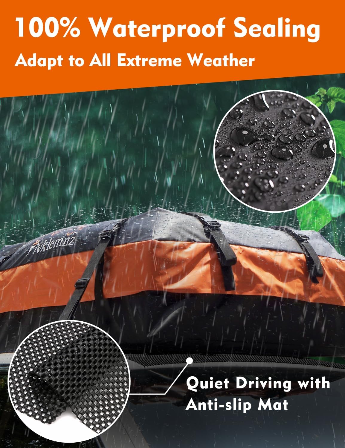 - 【Durable Material】: Made from 700D PVC, the FIVKLEMNZ roof bag features a double-layered waterproof cover design. All seams are constructed using heat-sealed welding and stitching techniques to ensure a completely seamless and waterproof structure. However, under extreme weather conditions or in cases of improper use leading to tears, 100% waterproof and rainproof functionality cannot be guaranteed. Please follow the user manual and use the product correctly.
