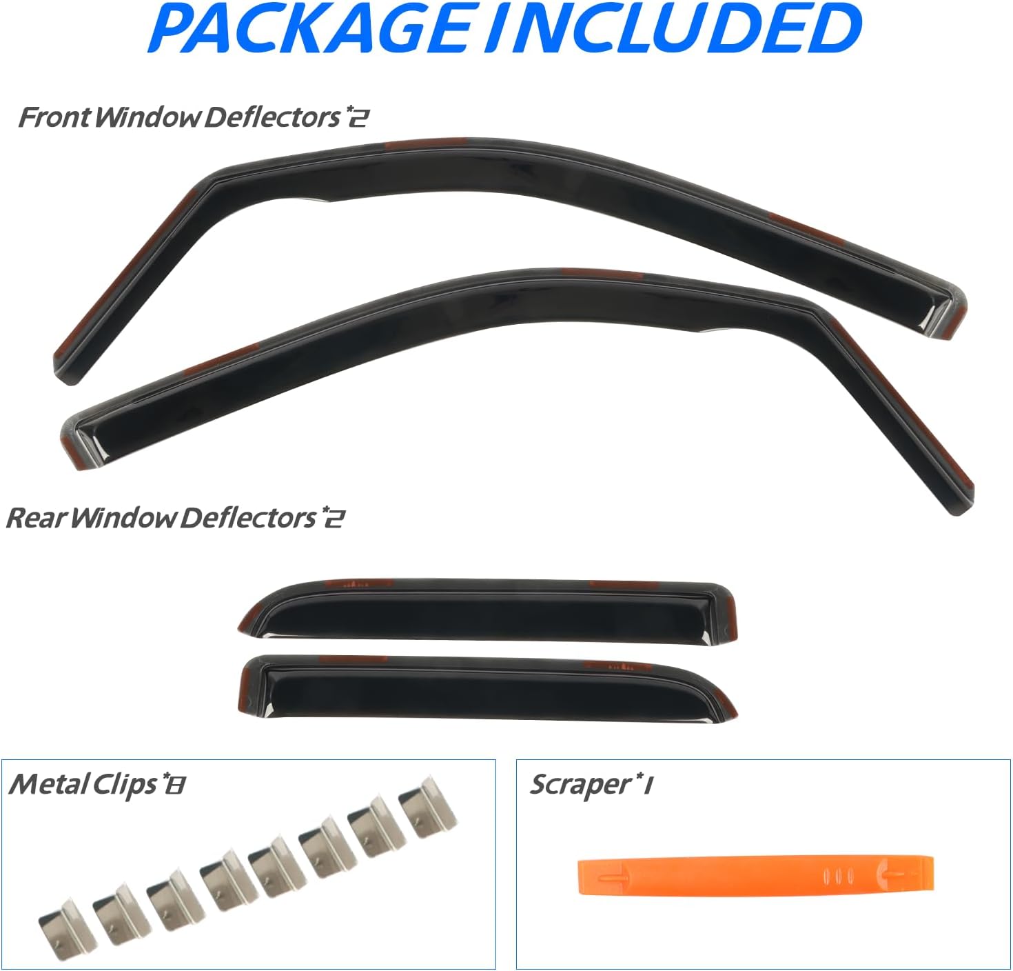 - 【Easy Installation】 Come with 4 pcs FULL-SIZE side window deflectors, 8 pcs clips, 1 pcs plastic Crowbar for a durable and secure installation. No complicated instructions are needed. Attention: Please apply the clip to fix the rain guards