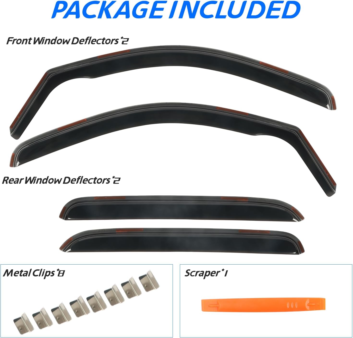 - 【In Channel Design】 CHYKORLA Window vent visors install in the window channel, provides perfect fit and sleek look for your car. Come with 4 pcs FULL-SIZE side window deflectors, 8 pcs clips, 1 pcs plastic Crowbar for a durable and secure installation. No complicated instructions are needed. Attention: Please apply the clip to fix the rain guards