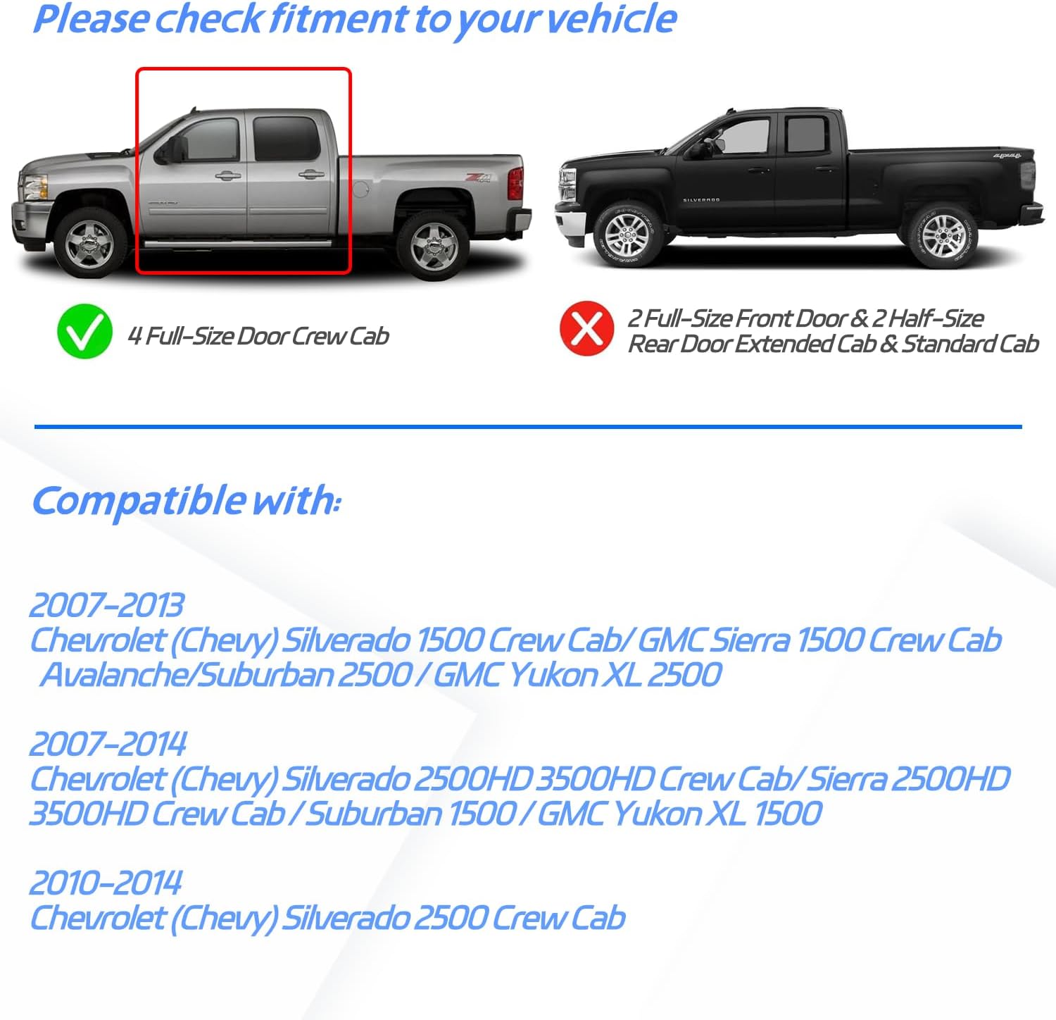 - 【Vehicles Fitments】CUSTOM ONLY fit for 2007-2013 Chevrolet Silverado 1500 Crew Cab, 2010-2014 Silverado 2500 Crew Cab, 2007-2014 Silverado 2500HD 3500HD Crew Cab, 2007-2013 Avalanche, 2007-2014 Suburban 1500, 2007-2013 Suburban 2500, 2007-2013 GMC Sierra 1500 Crew Cab, 2007-2014 2500HD 3500HD Sierra Crew Cab, 2007-2014 GMC Yukon XL 1500, 2007-2013 GMC Yukon XL 2500 (4 FULL-SIZE Doors)