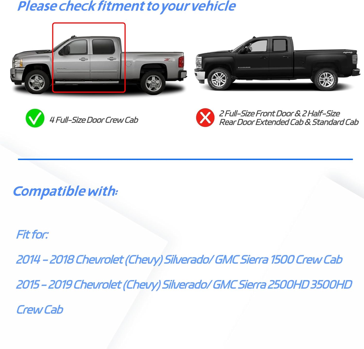 - : Vehicle Service Type Fit for 2014-2018 Chevrolet Silverado 1500 Crew Cab; 2015-2019 Chevrolet Silverado 2500 HD Crew Cab; 2015-2019 Chevrolet Silverado 3500 HD Crew Cab; 2014-2018 GMC Sierra 1500 Crew Cab; 2015-2019 GMC Sierra 2500 HD Crew Cab; 2015-2019 GMC Sierra 3500 HD Crew Cab (ONLY for 4 FULL-SIZE Doors) Fit for 2014-2018 Chevrolet Silverado 1500 Crew Cab; 2015-2019 Chevrolet Silverado 2500… See more