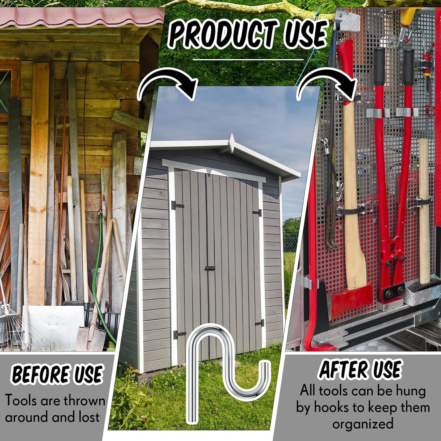- Universal Design: enjoy a functional and universal design that makes these wall mount hooks an essential for most sheds; By arranging these hooks on your shed walls, you can maximize the utilization of your shed, enhancing its capacity to hold a multitude of tools or goods in an orderly manner