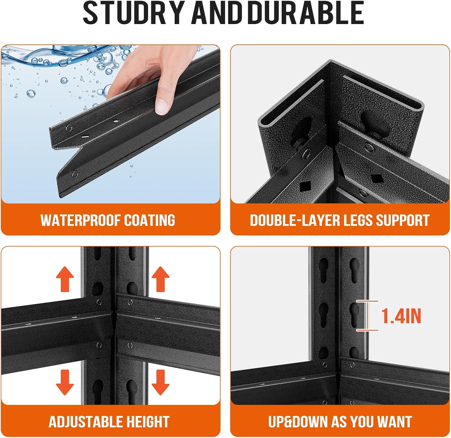 - 【2500LBS Garage Storage Shelves Heavy Duty】:Thickened metal shelving are made of quality metal material, covered with rust-proof powder coating, anti-scratch, rust-resistant, durable and easy to clean. Each level has sturdy support rib and can hold up to 500lbs. Garage shelf's total max load weight is 2500lbs. Double thickened metal legs are designed to provide excellent support. This rack shelf is more stable and sturdy than regular metal shelf for long-term use.