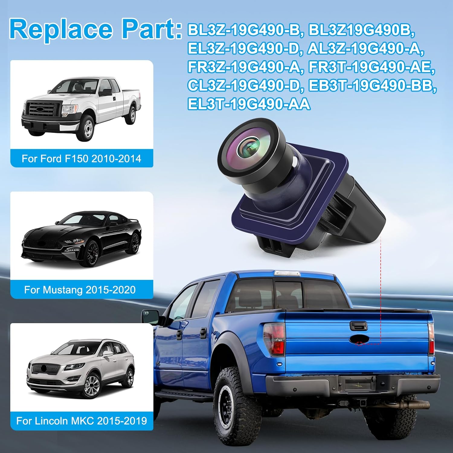 - Backup Carmera Fit Modles: This Rear View Backup Carmera is compatible with Ford F-150 2010-2014 Ford Mustang 2015-2020 , Compatible with Lincoln MKC 2015-2019. Please check the fitment before purchasing. OE Part Numbers: BL3Z-19G490-B BL3Z19G490B EL3Z-19G490-D AL3Z-19G490-A FR3Z-19G490-A FR3T-19G490-AE CL3Z-19G490-D EB3T-19G490-BB EL3T-19G490-AA. No coding required.