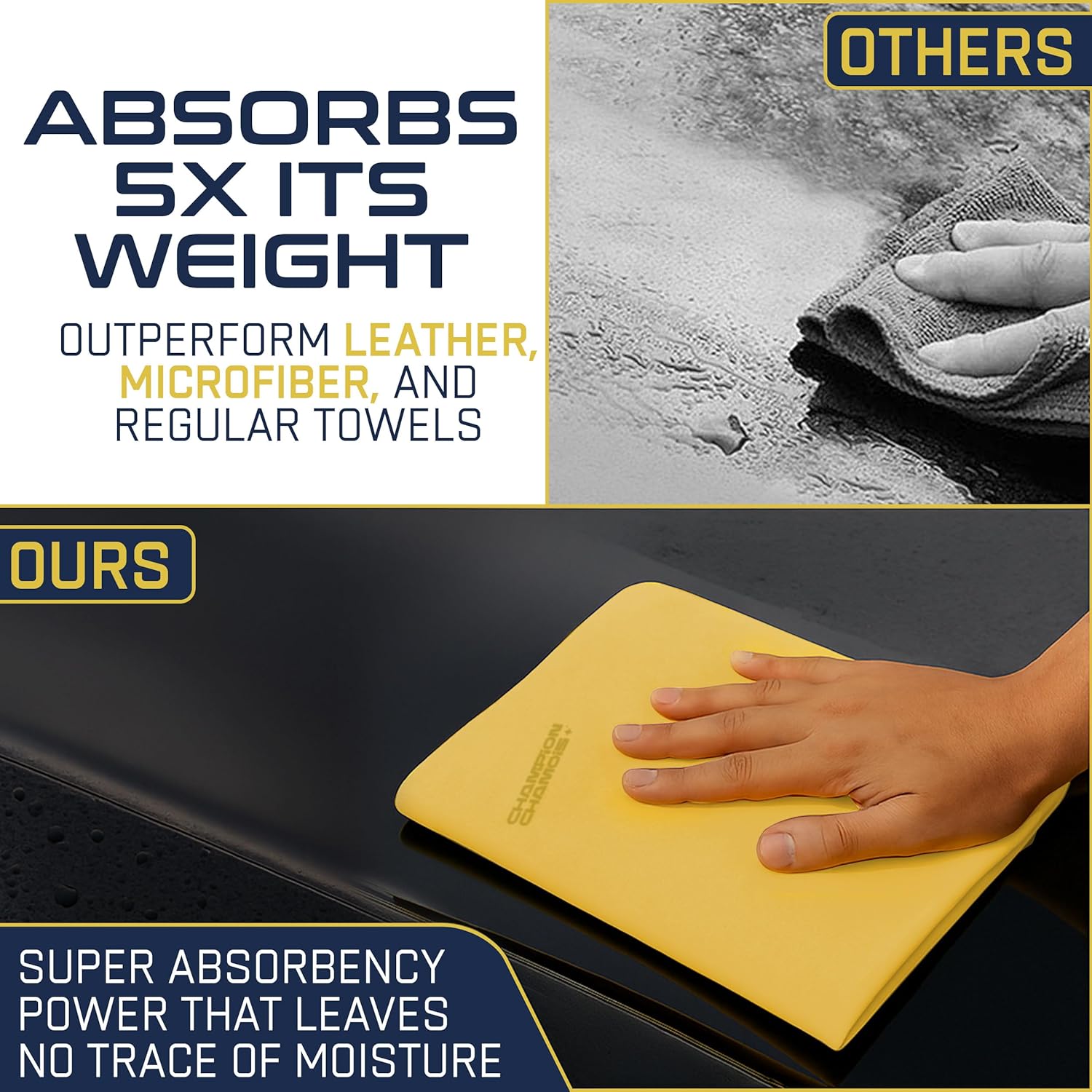 - SUPERIOR ABSORBENCY - Champion Chamois UltraAbsorb+ cloths soak up liquids like no other, making them ideal for car care and spills. With up to 50% more absorbency than competitors and 300% more than microfiber towels, our chamois is a game-changer.