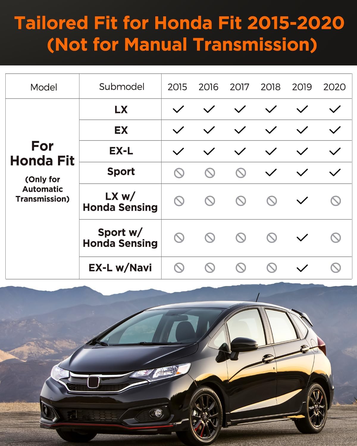 - Custom Fit for Honda Fit 2015-2020: Whether you drive a car for Honda Fit LX, Sport, EX, or EX-L models models, our car floor mats provide an ideal fit. Car accessories for Honda Fit all weather floor mats, custom for Honda Fit 2015-2020 models (Only for Honda Fit Automatic Transmission Models)