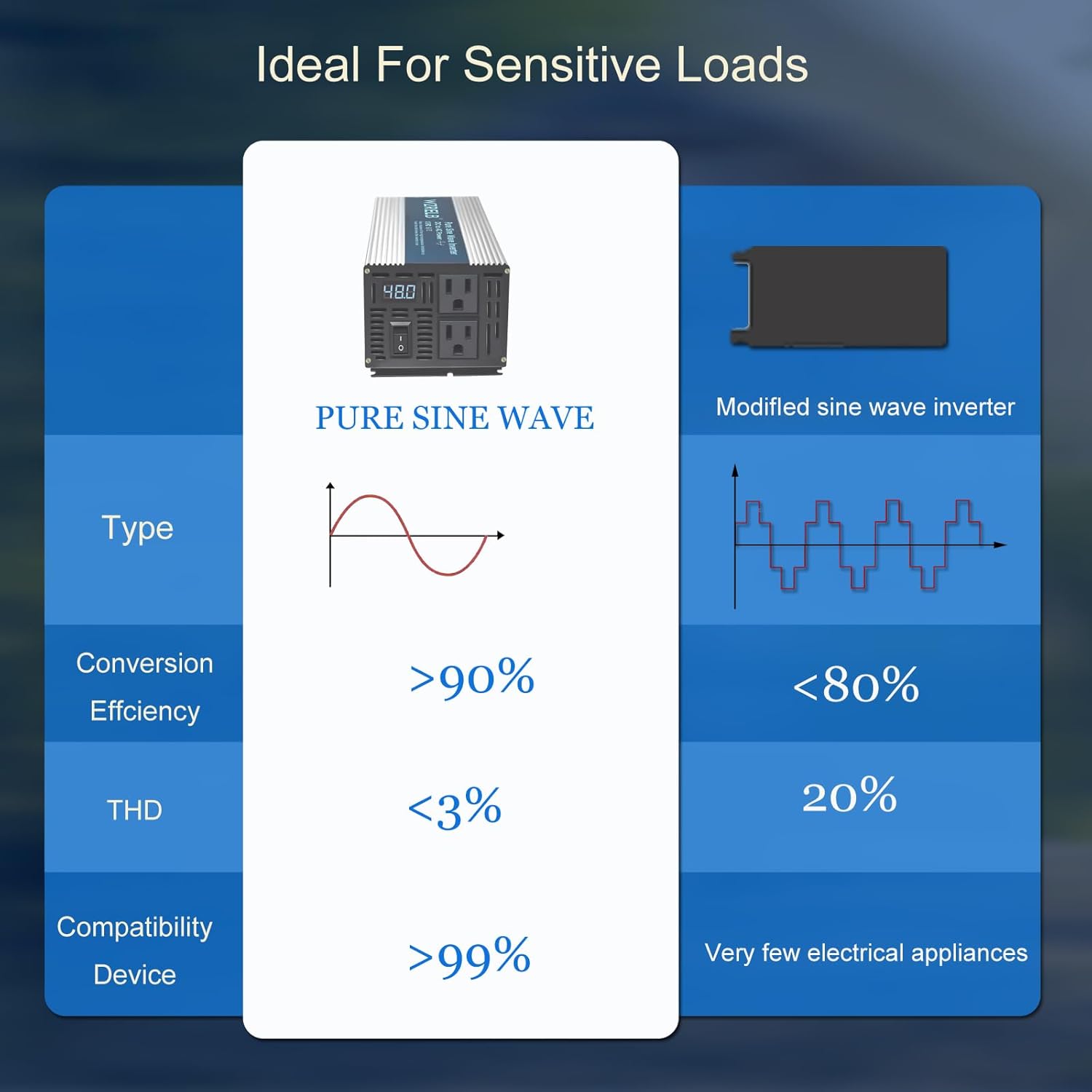 - 【LED Display Design】Features a digital LED Display for input voltage ,allows you to easily monitor the input volt , master the power inverter working status,and enjoy clean, stable pure sine wave power that keeps your devices running smoothly.