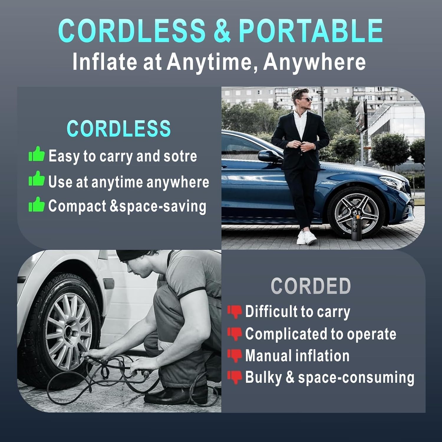 - 【Quick and Efficient Inflating】 This portable air compressor for car tires is a great solution for emergencies on the way. This car tire air pump portable features a powerful motor that can quickly inflate a 195/65R15 car tire from 29psi to 35psi within 1 minute. It can save your valuable time in emergencies or routine maintenance.
