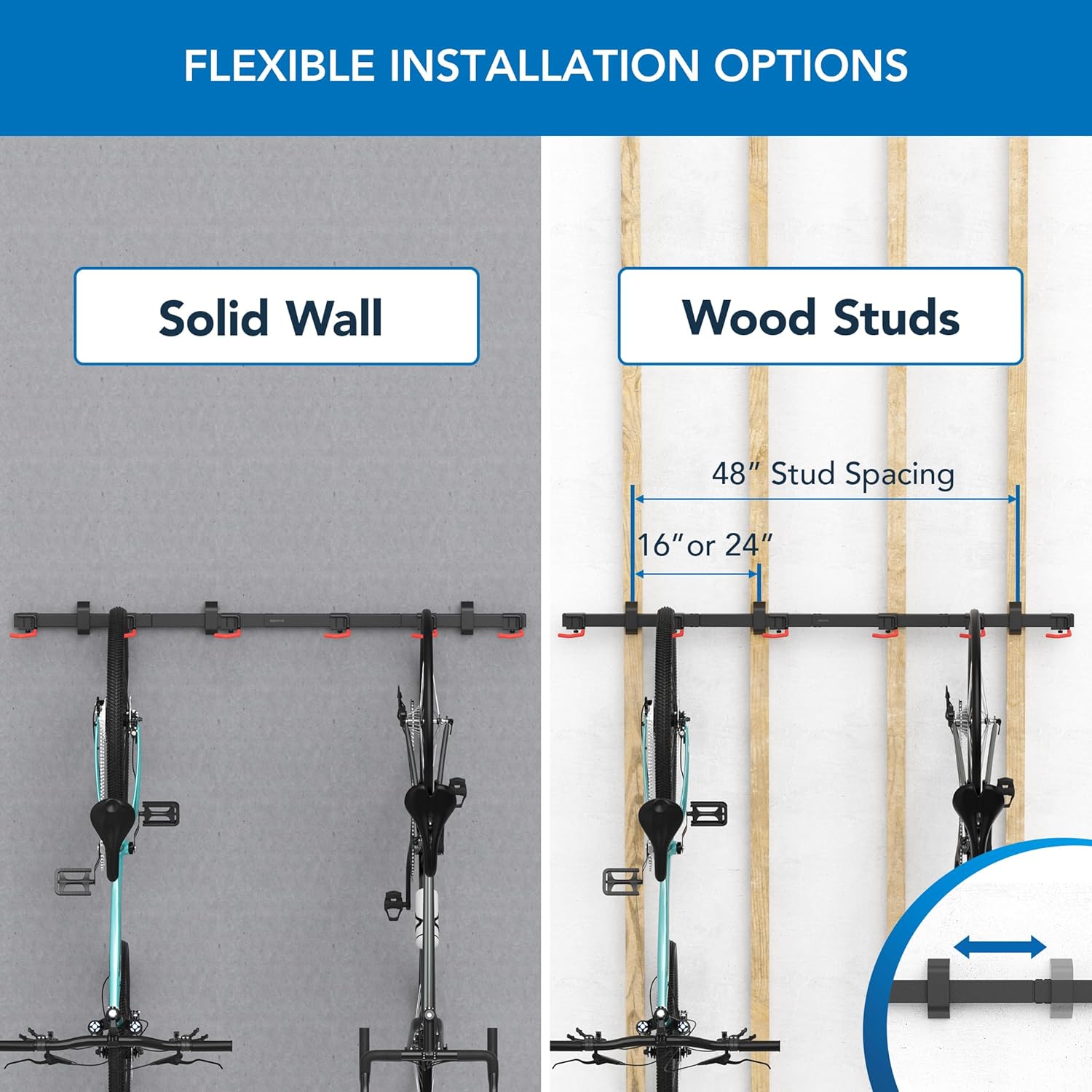 - PROTECTIVE RUBBER-COATED HOOKS – Soft-padded hooks prevent scratches and damage to your bike frames, keeping them in excellent condition while stored on the rack. EASY INSTALLATION ON SOLID WALLS – Designed for wood studs and solid walls, this wall mount bike rack includes all necessary hardware, making setup quick and simple for any garage or shed.