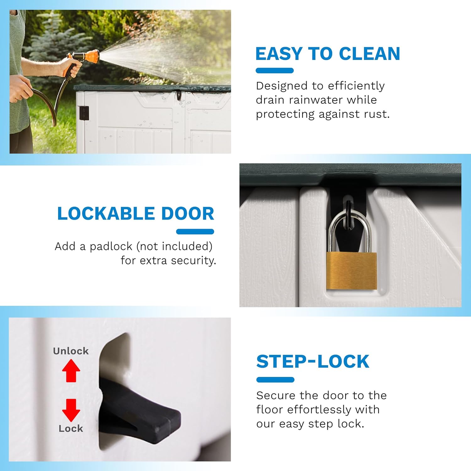 - Sturdy Outdoor Shed with Floor: Outdoor shed with floor provides stability and security for heavier items. It works perfectly as a tool shed outdoor storage and a resin storage shed, offering reliable protection against the elements while keeping your tools and equipment organized.