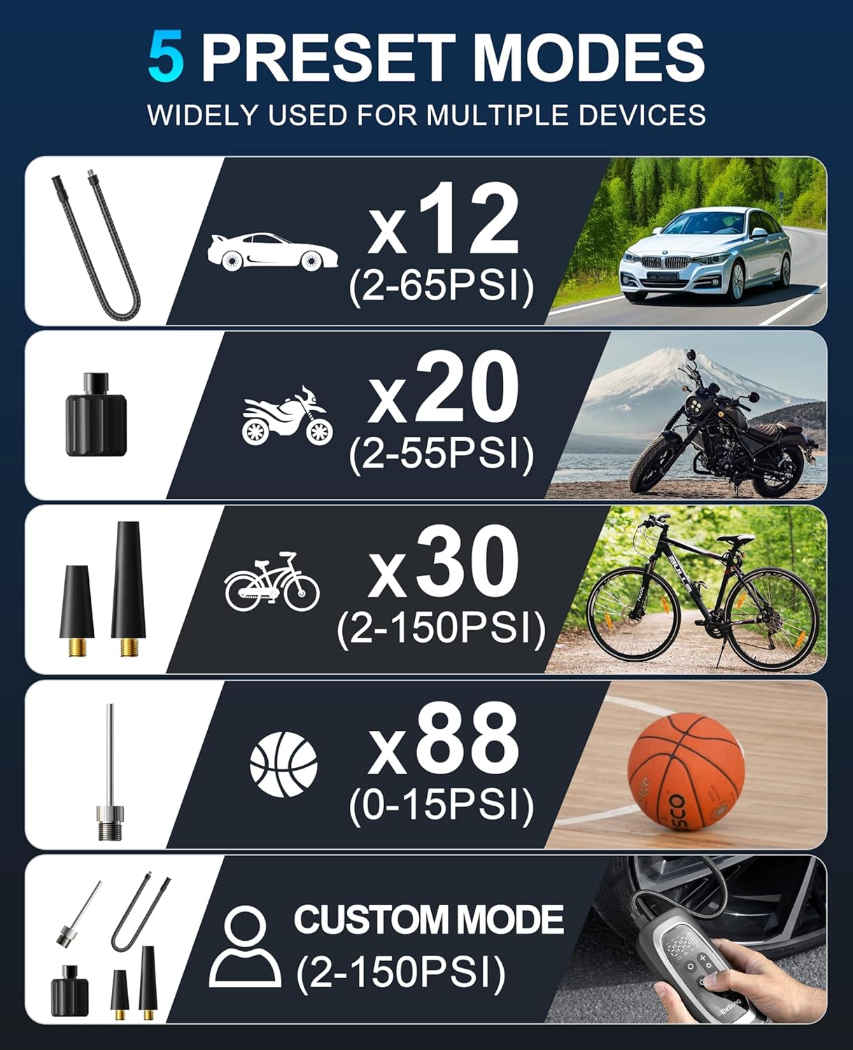 - Bike Pump + Air Pump for Inflatables & More: This all-in-one tool functions as a bike pump, car tire inflator, and air pump for inflatables like balls, air mattresses, and pool floats. Includes 4 valve adapters for compatibility with cars, e-bikes, motorcycles, scooters, and wheelchairs