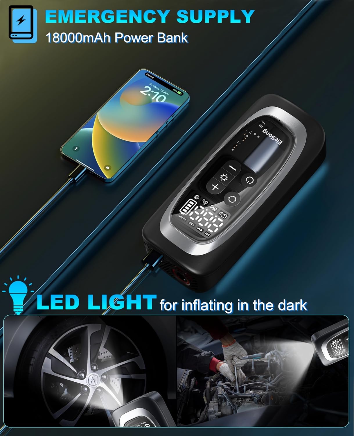 - Cordless, Long Runtime: No cables, no limits. This air compressor portable offers extended cordless use and to charge your phone or tablet via USB or car adapter—ideal for outdoor adventures and emergency kits