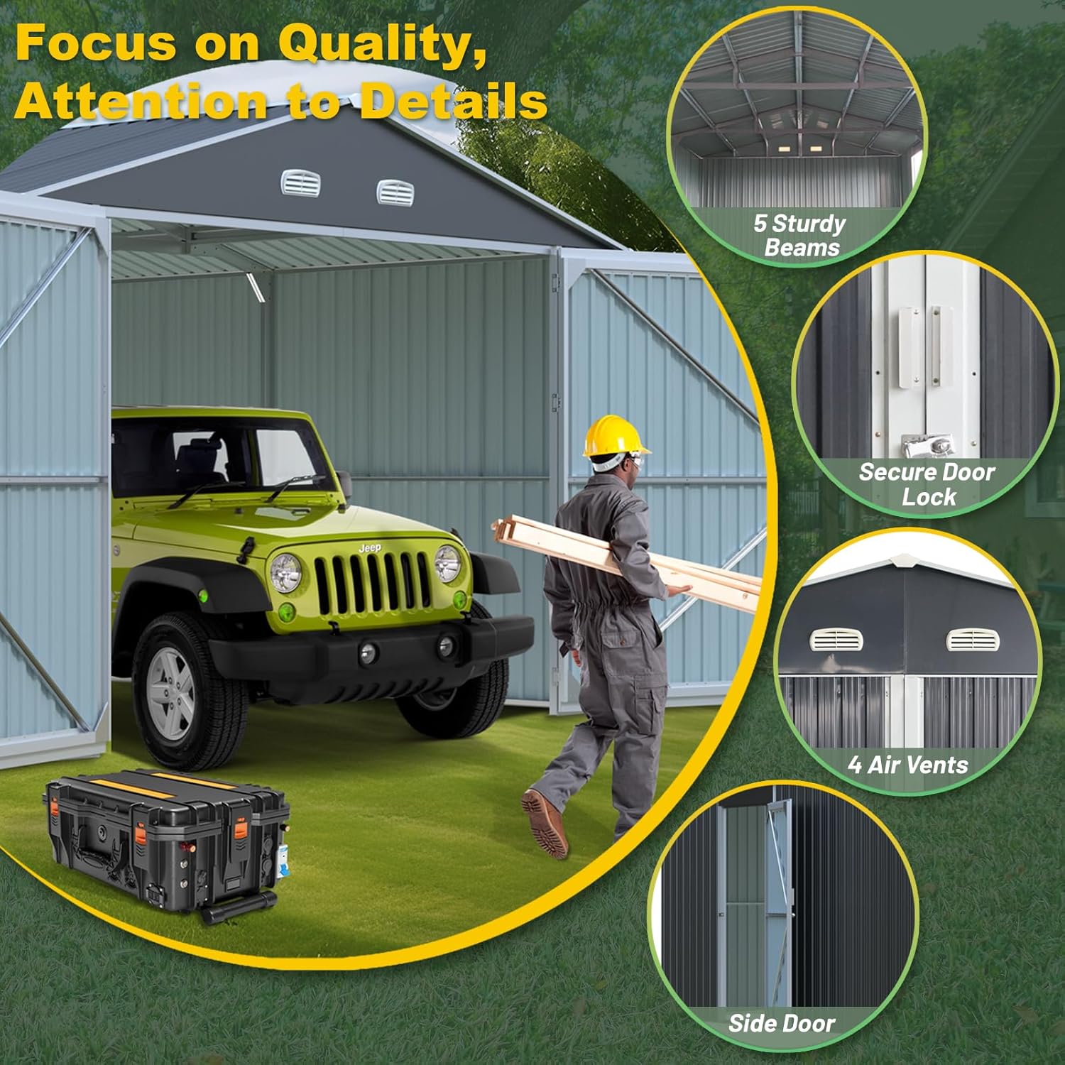 - Sturdy and Durable Construction: Built with a steel tube support frame and reinforced galvanized steel, this metal garage shed is engineered for durability. The steel pipes feature a 1mm powder coating, providing excellent resistance against weather elements. Reinforcement ribs and inner anchors ensure a robust structure that can be securely fixed to the ground.