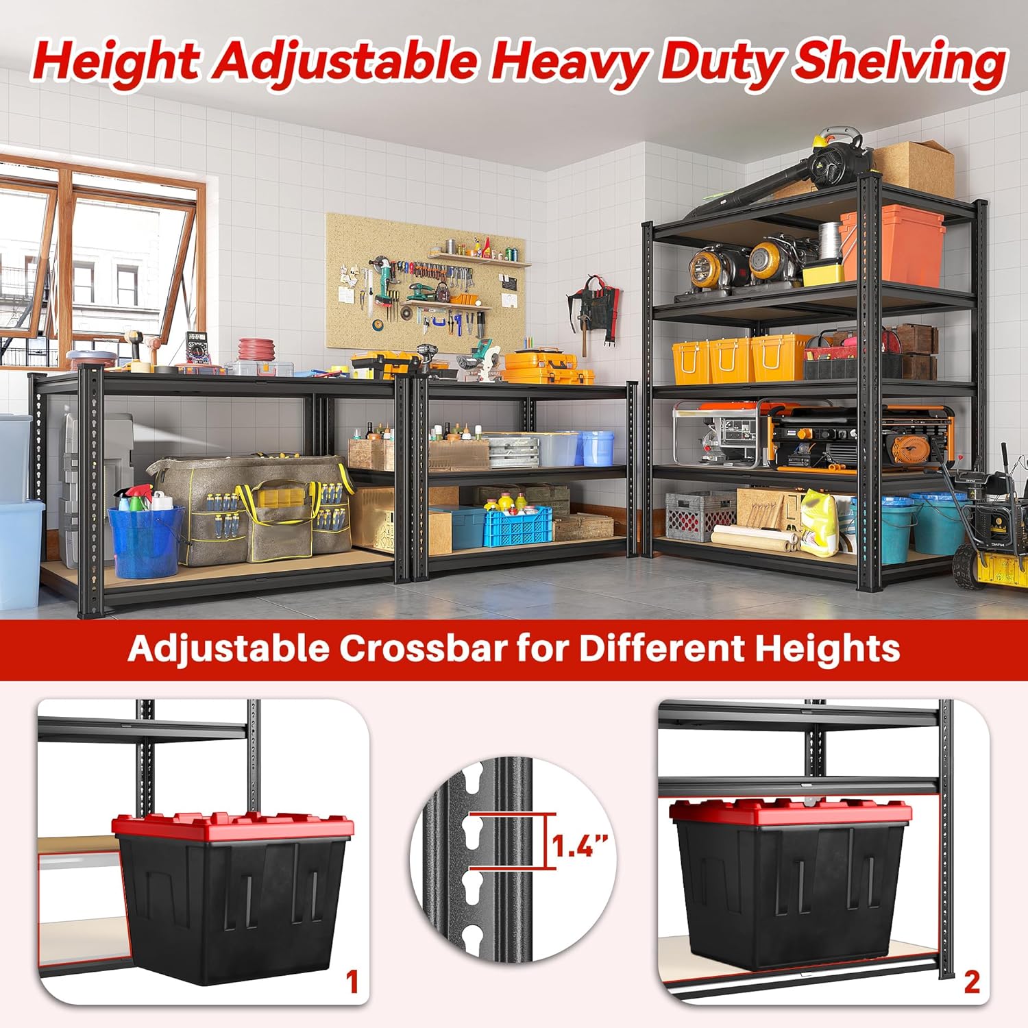 - 【2300LBS Strong Storage Shelves】This garage shelving is strong enough to handle garage and tool shed storage. Manufactured from high-grade steel with rolled-edge craftsmanship. Perfect for garage, basement, warehouse, kitchen, shed organization