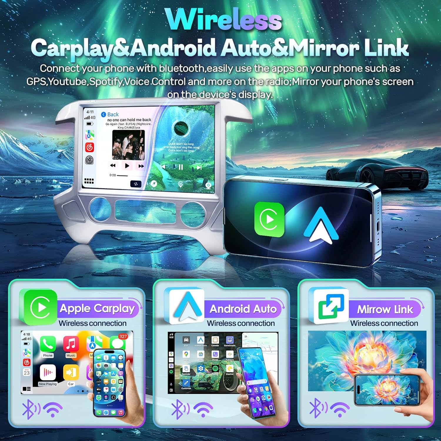 - Wireless CarPlay & Android Auto: For gearzbtor silverado radio stay connected with wireless CarPlay and Android Auto,giving you easy access to GPS, music,messages,and calls without touching your phone;Both Siri and Google Assistant are supported for voice control;Plus,original steering wheel controls are retained,so you can adjust volume,switch songs,and answer calls while keeping your hands on the wheel;Support heated/cooled seats,a/c,door status information if your oem car have