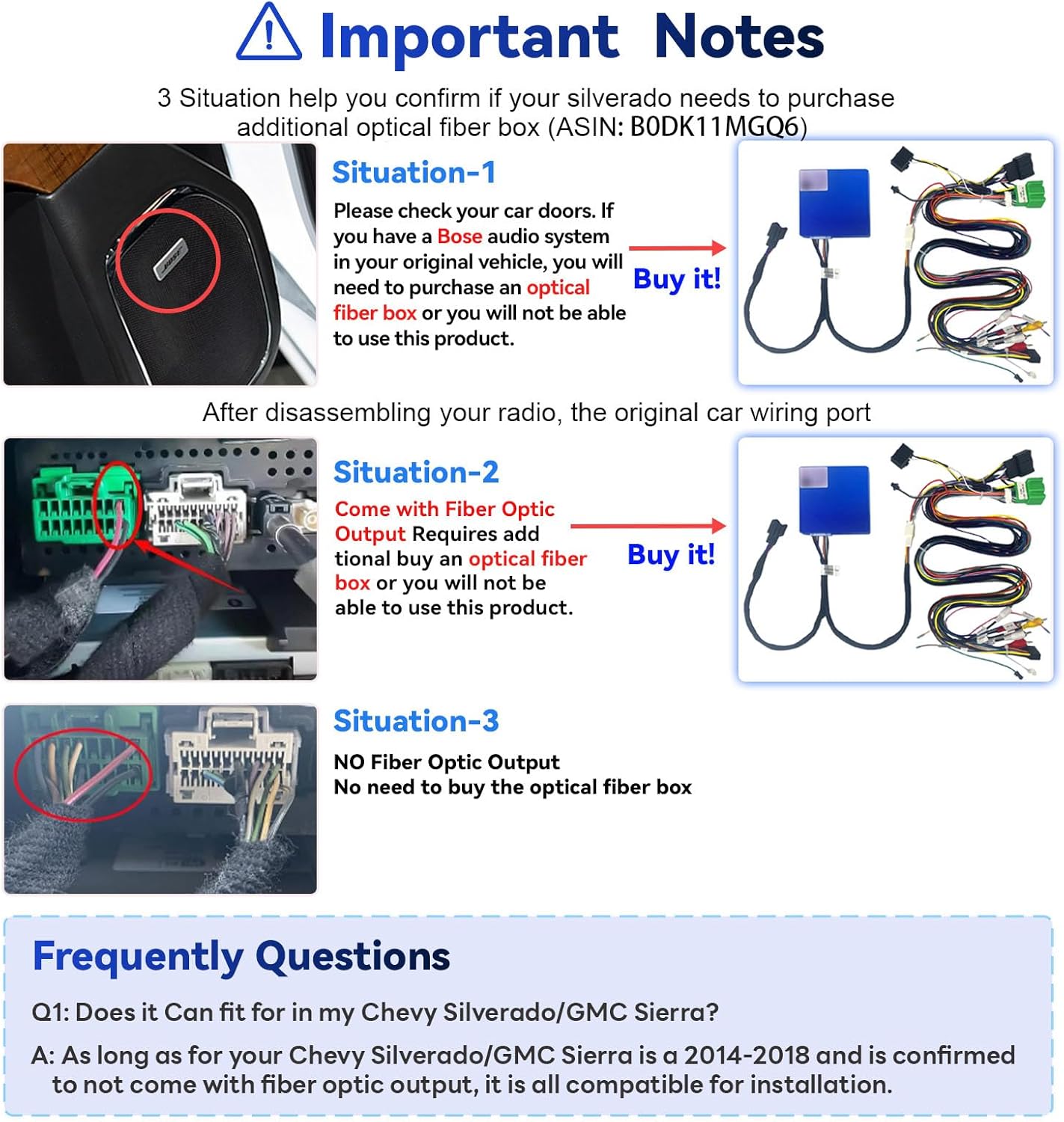 - Compatible Car Models: Our 13.1" android 12 car radio for chevy silverado gmc sierra 1500 2500 3500 2014 2015 2016 2017 2018;Includes everything you need to Install, plug-and-play (With detailed installation video and instructions);Original car for bose audio system,and you need to purchase a audio harness (ASIN: B0DK11MGQ6) to use; For 7" silverado radio want to use factory backaup camera,please reach out to our technical support for any installation issues asap,we are happy to assist you