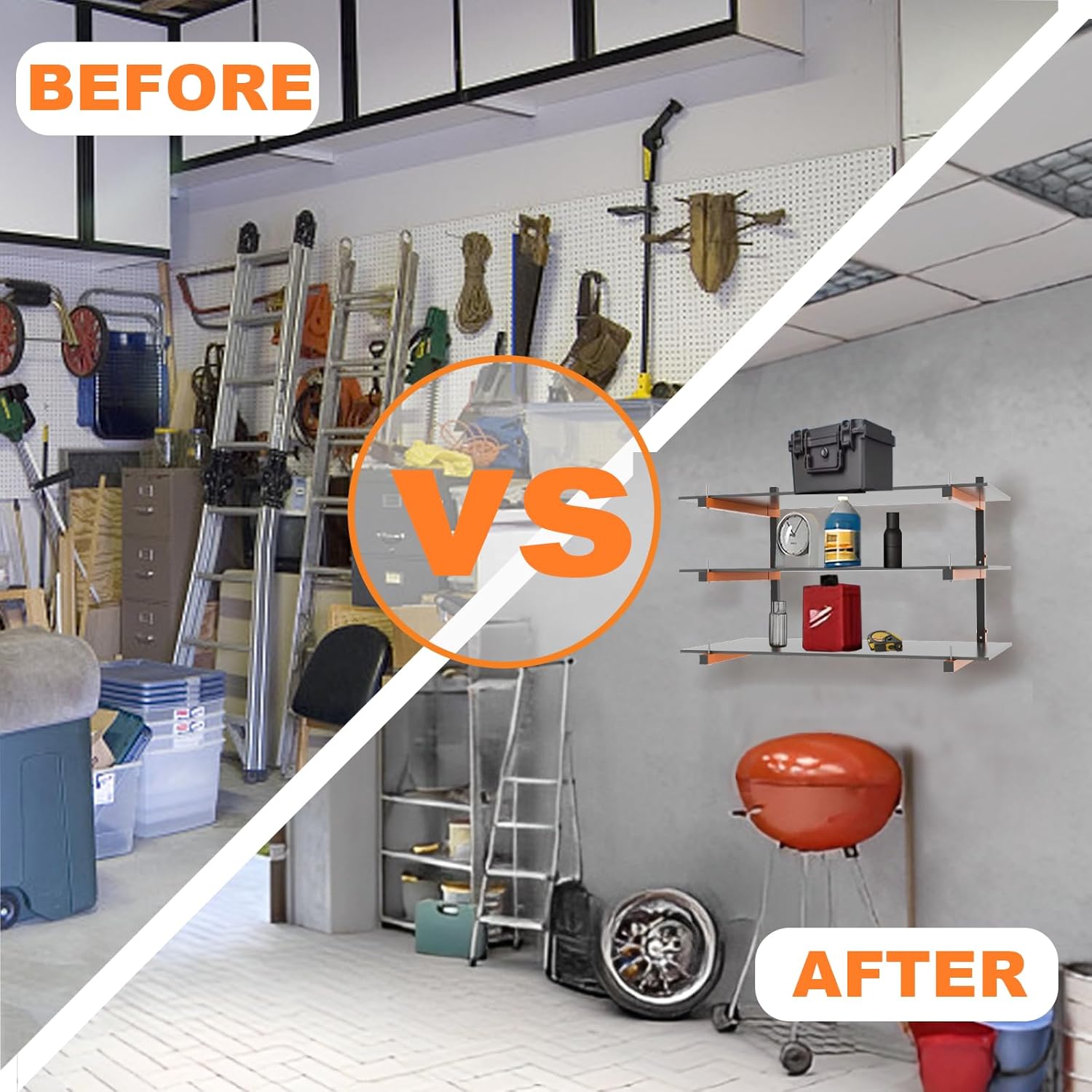 Lumber Rack Wall Mount, Heavy Duty Wood Storage Racks, 3-Level System Garage Shelving, 380 Lbs Capacity Organizer Shelves, Folding Orange Brackets, 2 Pack Hanging Metal Shelf for Indoor and Outdoor