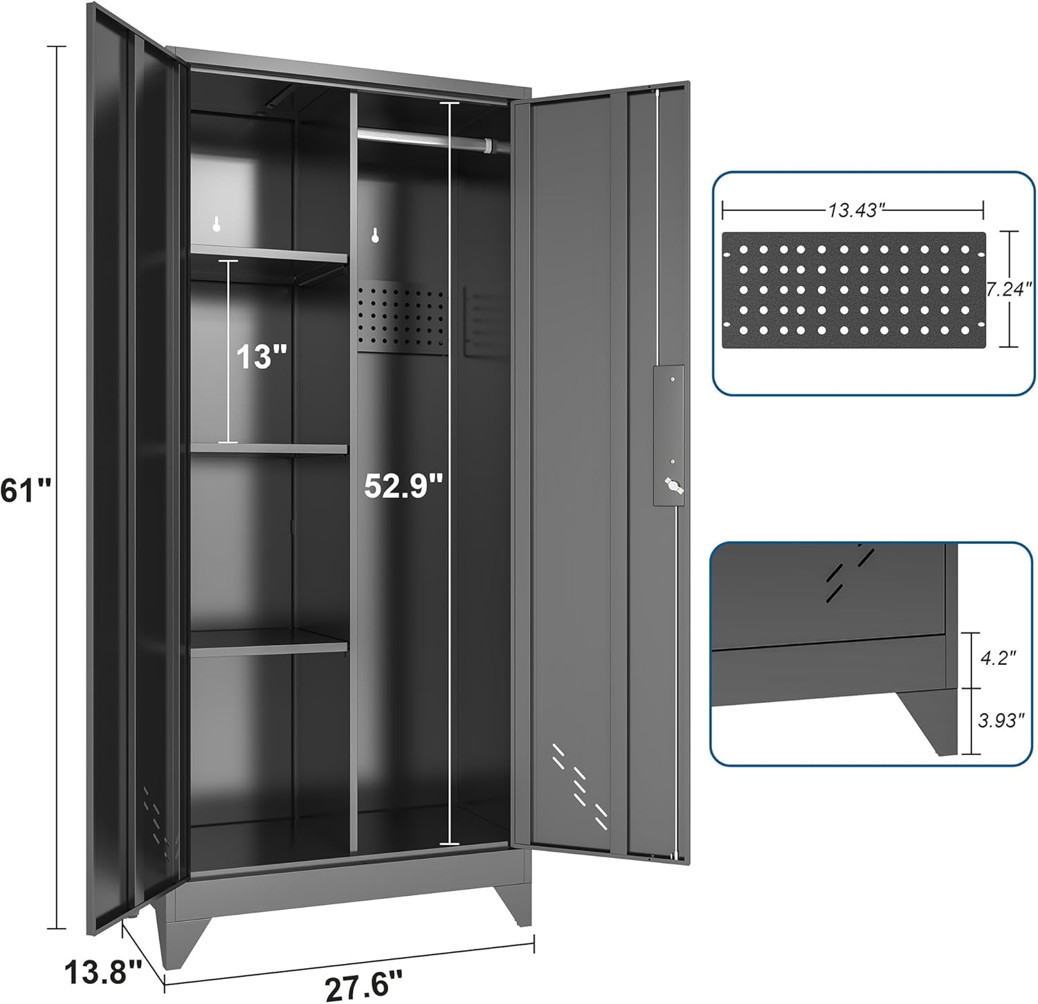 - 【Appropriate Size】13.8”D x 27.6”W x 61”H.This size saves space and allows you to place it anywhere in your home. Broom closet storage cabinet comes with crossbars and hooks that you can use to store cleaning supplies, outdoor tools, garage tool chest and sports equipment.