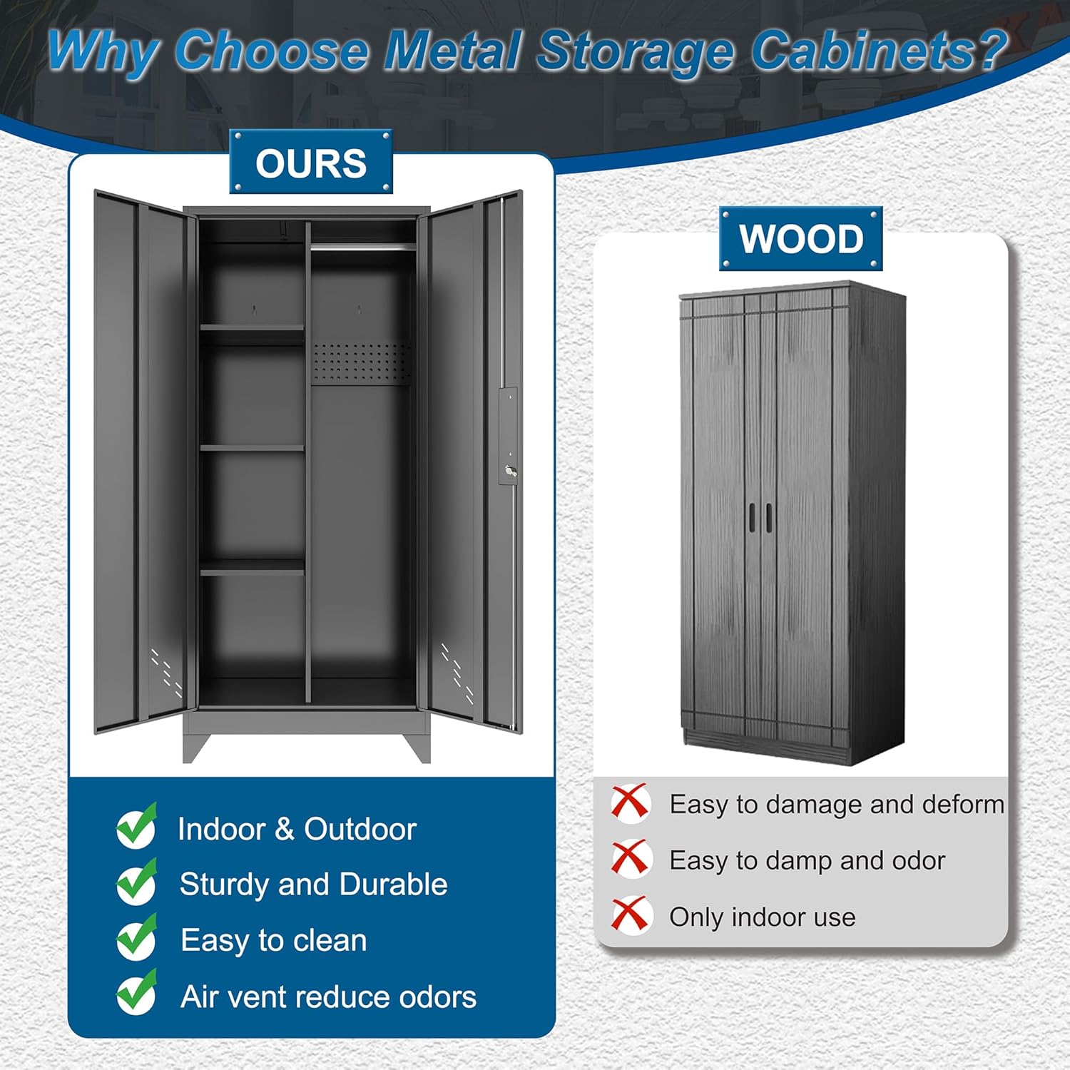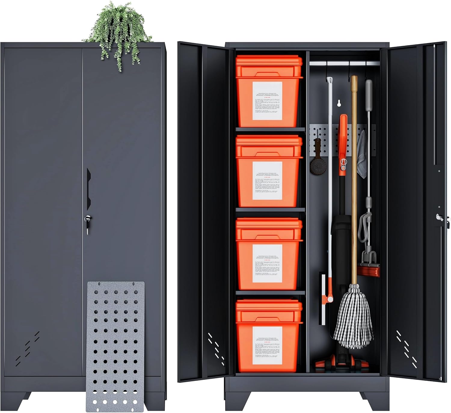 - 【Safety Door Lock】The locking utility janitorial cabinet is equipped with a secure door lock, so you don't have to worry about losing items even when used outdoors. You can use it in places you need, such as kitchen, patio, utility rooms, homes, basements.