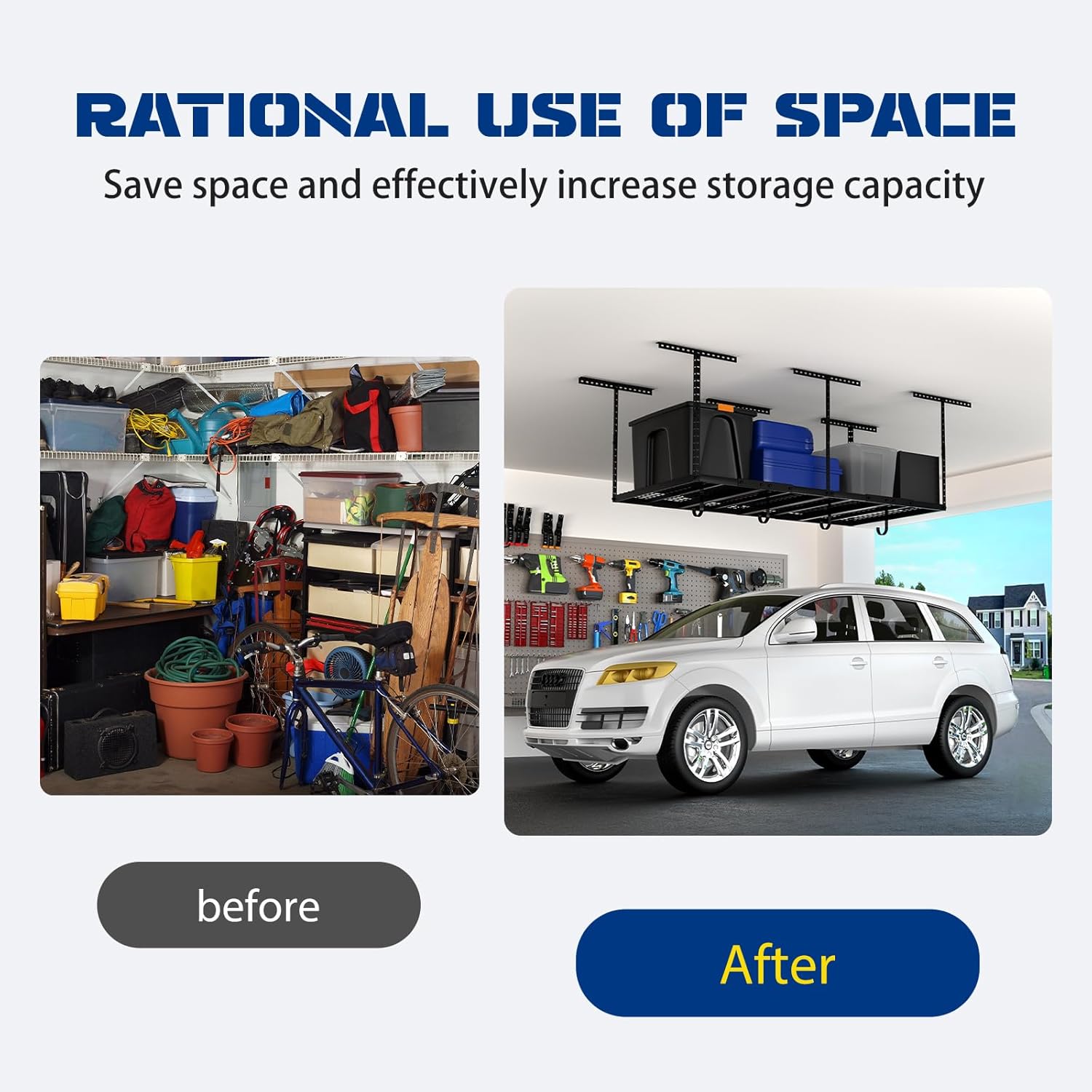 - Easy DIY Installation: Our included installation template makes setup simple and efficient. This overhead storage rack is compatible with all ceiling joist spacing ≤24", and for spacing >24", it fits ceiling spacing of 48". Perfect for DIY enthusiasts looking to enhance their garage storage.