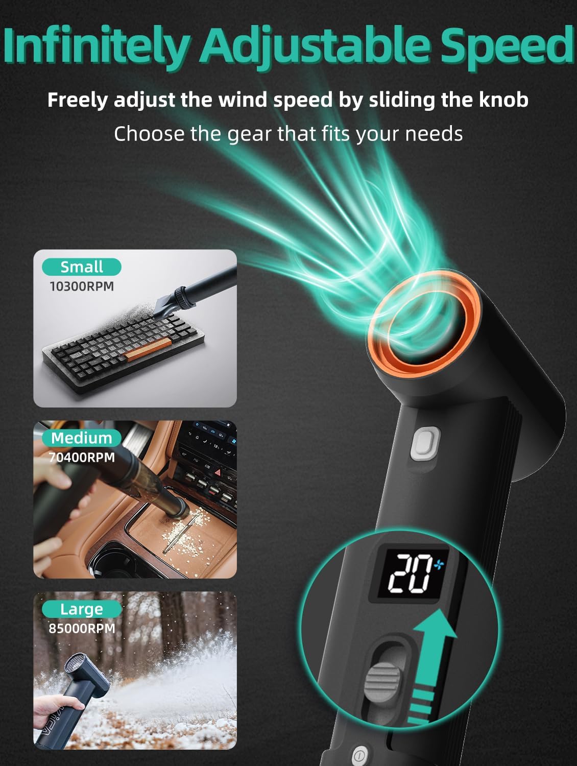 - 【One-Touch Turbo Mode for Maximum Power】Activate extreme boost with a single press, unleashing maximum wind speed and thrust to handle heavy-duty cleaning jobs with ease.
