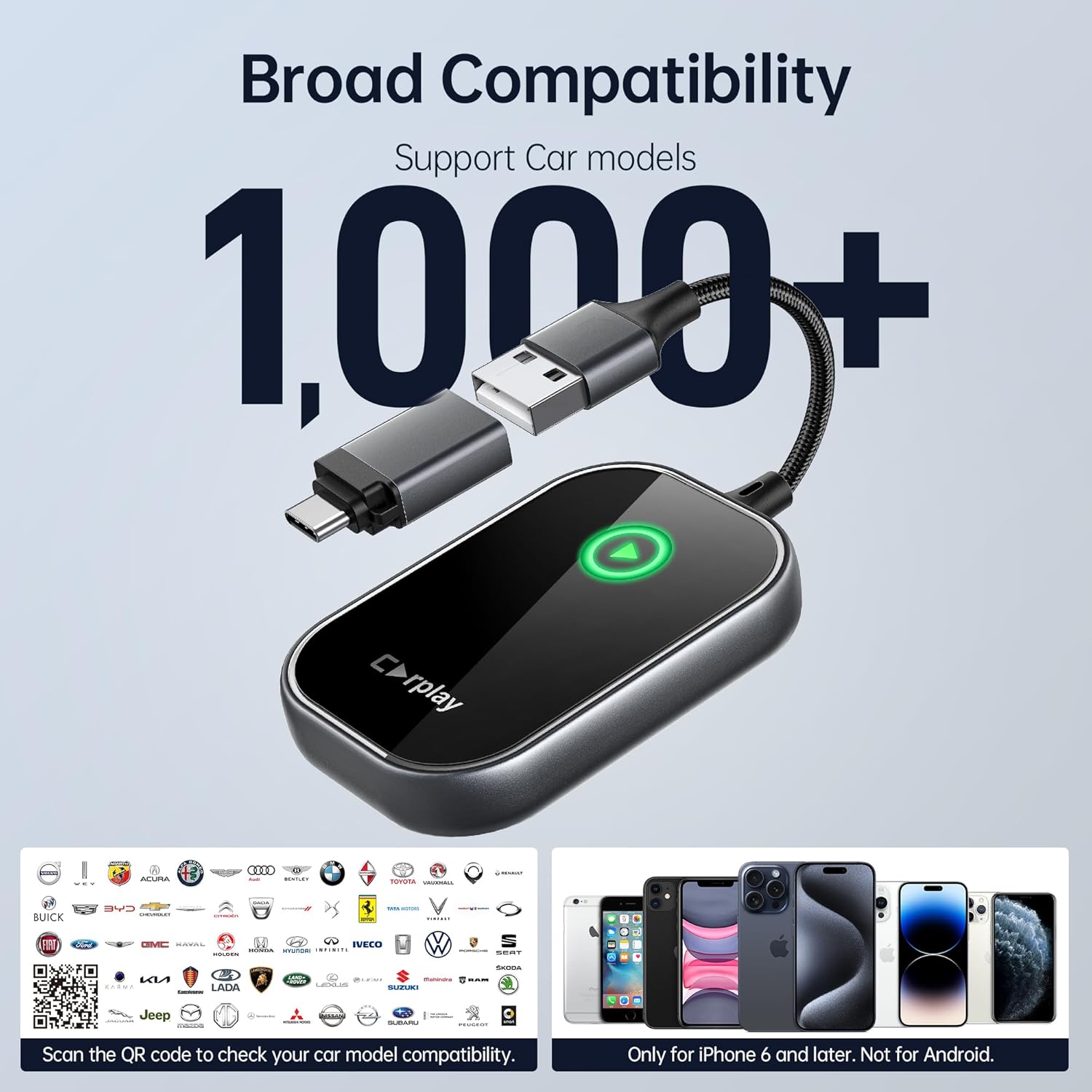 - Extensive Compatibility: This adapter supports over 1000 car models and iPhones starting from iPhone 6. It’s made exclusively for vehicles with wired CarPlay, and you can easily check compatibility via a QR code.