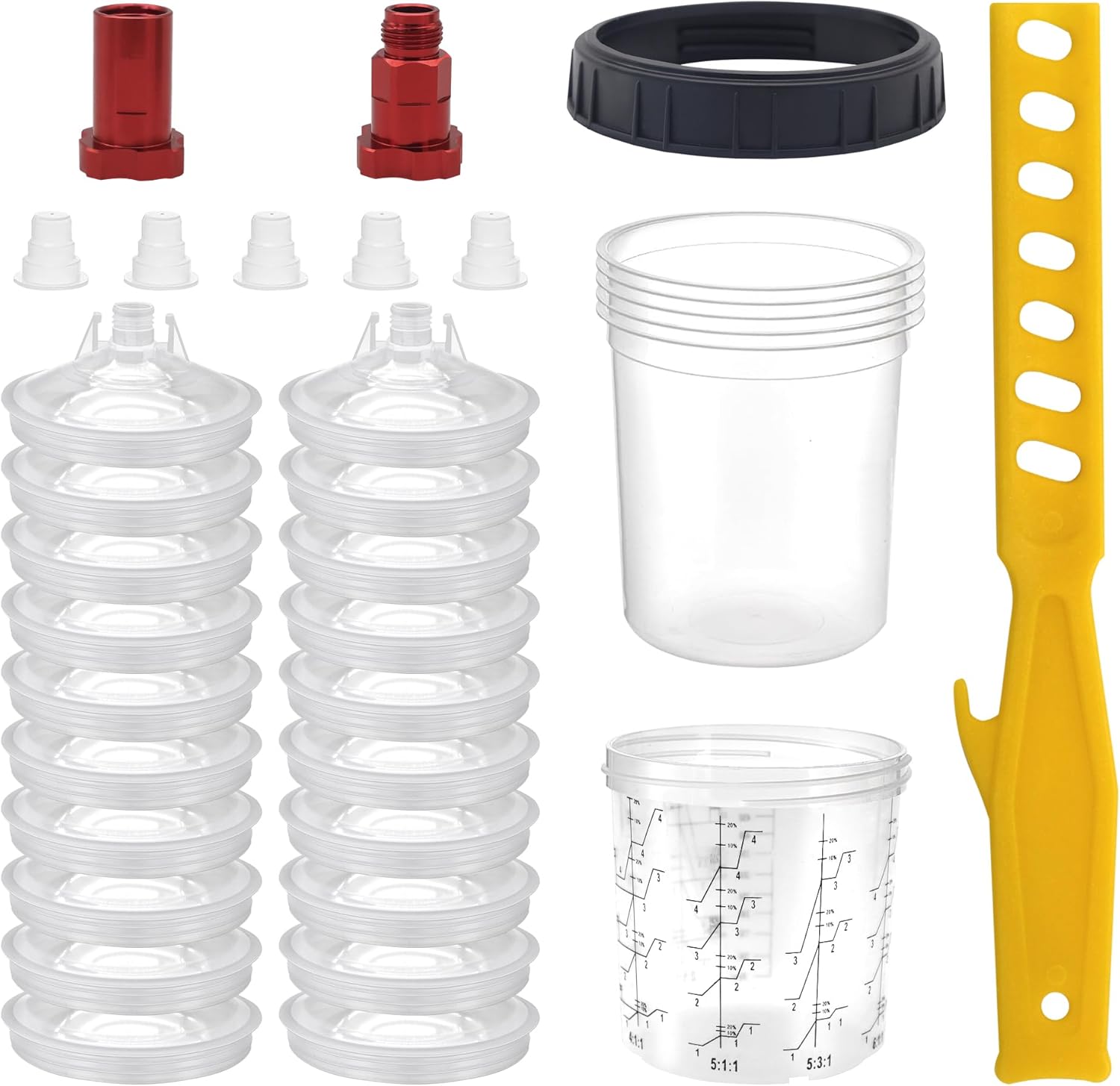 Disposable Paint Cup 20 Ounce (600 ml) Kit - 20 Paint Mixing Cups Liner, 20 Filter Lids, 2 Spray Gun Adapters, 5 Sealing Plugs, 1 Hard Cup,1 Sealing Ring, 1 Stirrer, for Car & DIY Painting