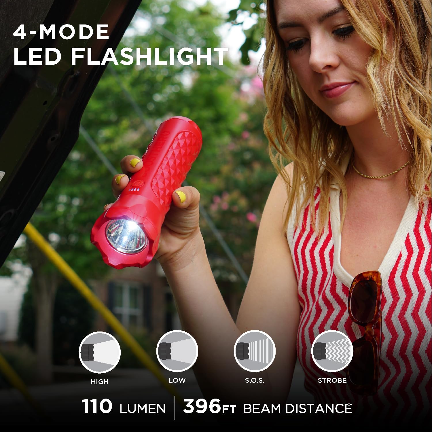 - 4-Mode LED Flashlight - Lightweight 110-Lumen LED Flashlight has 4-Modes (High Beam, Low Beam, S.O.S. & Strobe). 396ft reach is the perfect tool for daily use, traveling, outdoor activities, and in emergency situations.