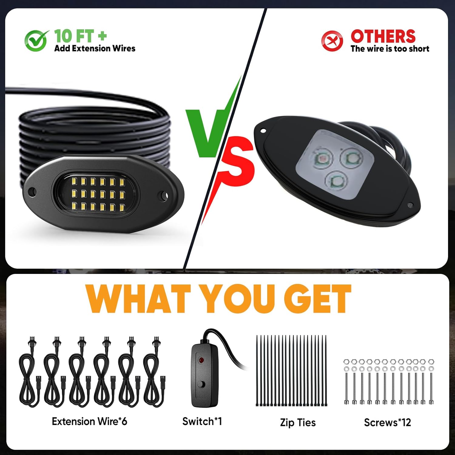 - 【White Rock Lights with Switch】Equipped with an easy-to-use switch, you can effortlessly control the pure white rock lights kits, allowing you to turn them on or off as needed, helping to conserve battery power