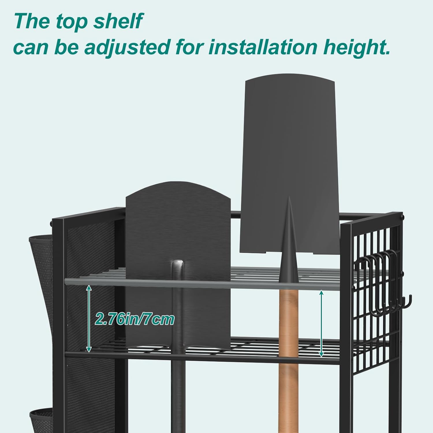 - Flexible three-layer storage shelf: The three-layer design combined with a top adjustable shelf allows for easy adaptation to different heights of gardening tools (shovels, leaf rakes to bow rakes, mops and brooms), potted plants or cleaning supplies. 5 hooks expand the hanging space, and the large-capacity side storage bag is specially designed for small items such as gloves and pruning tools, achieving three-dimensional classified storage and maximizing the use of vertical space in garages, sheds or balconies.