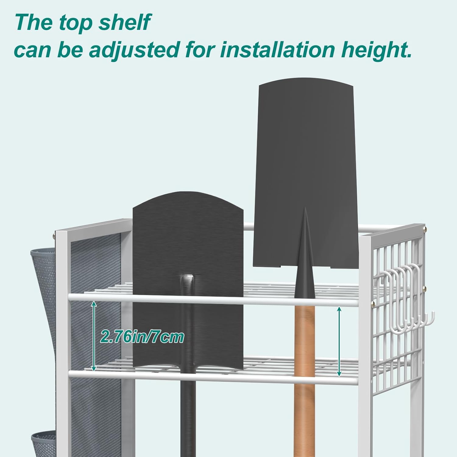 - Flexible three-layer storage shelf: The three-layer design combined with a top adjustable shelf allows for easy adaptation to different heights of gardening tools (shovels, leaf rakes to bow rakes, mops and brooms), potted plants or cleaning supplies. 5 hooks expand the hanging space, and the large-capacity side storage bag is specially designed for small items such as gloves and pruning tools, achieving three-dimensional classified storage and maximizing the use of vertical space in garages, sheds or balconies.