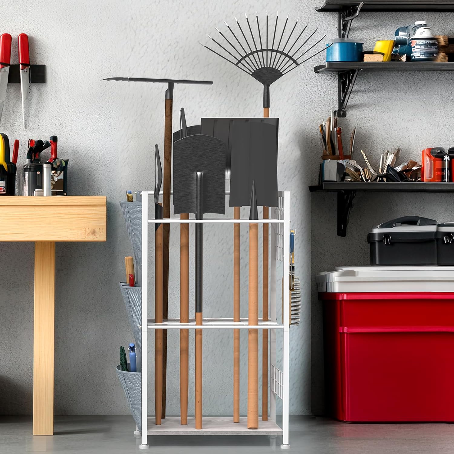 - Multi-scenario compatibility: The overall design is simple, seamlessly integrating into scenarios such as garages, gardens, kitchens, and workshops. In gardening scenarios, it can neatly store various gardening tools; in household cleaning scenarios, it can hold mops, brooms, cleaning agents, etc.; in workshops, it can organize maintenance tools and parts. The flexible storage method makes the space cleaner, enhancing the efficiency and comfort of work and life.