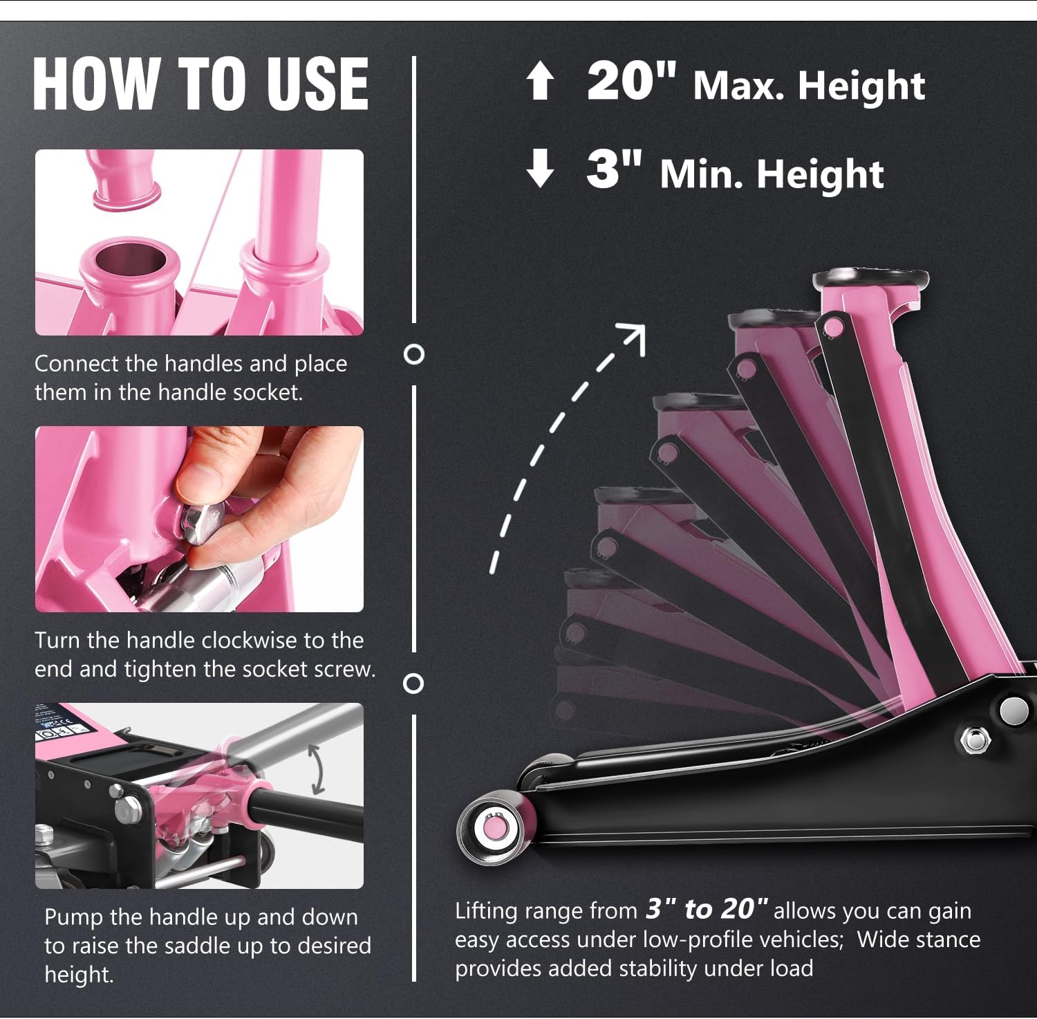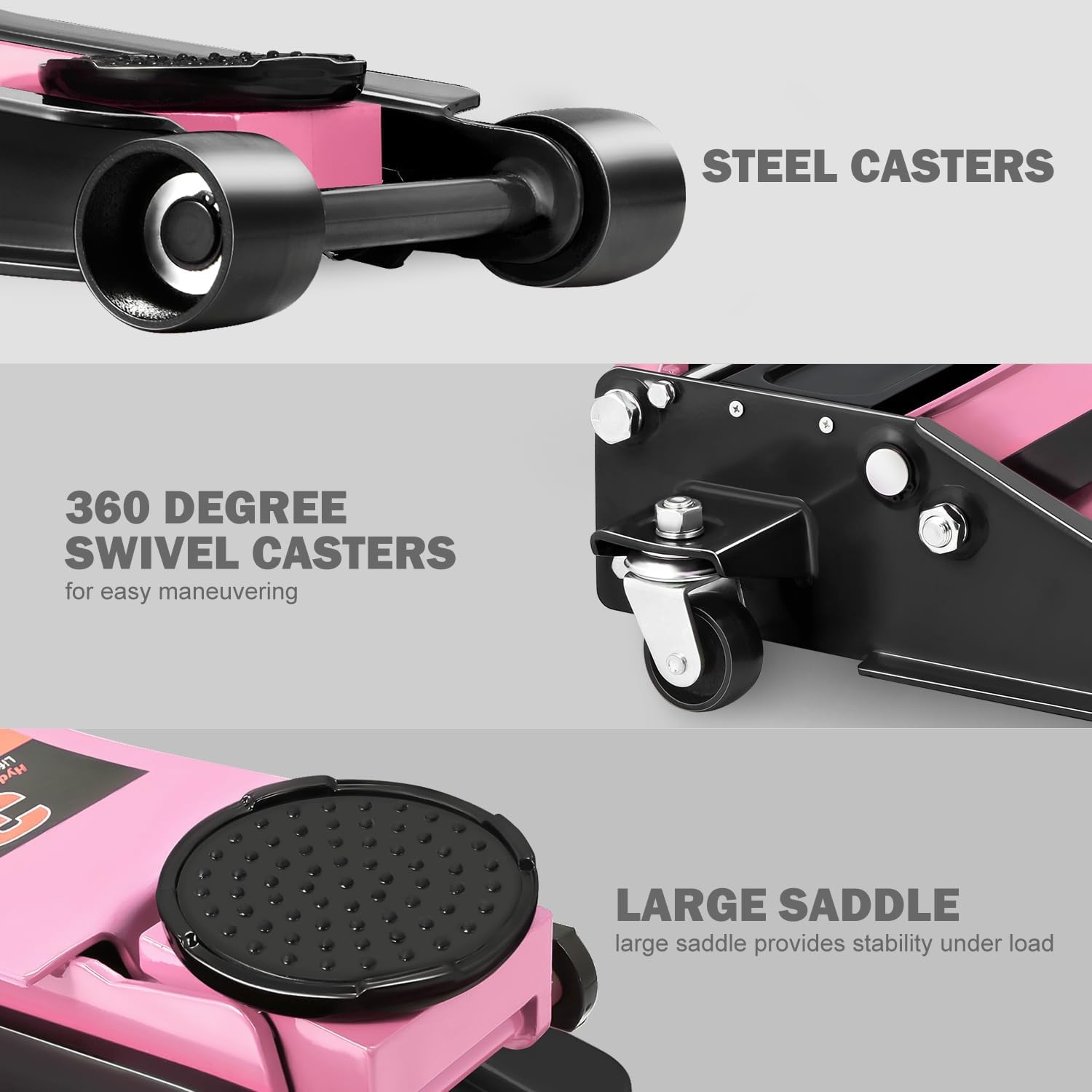 DNA MOTORING Low Profile Hydraulic Trolley Service/Floor Jack, 3 Ton (6000 lbs) Capacity, Lifting Range 3"-20", Pink, TOOLS-00475-PK