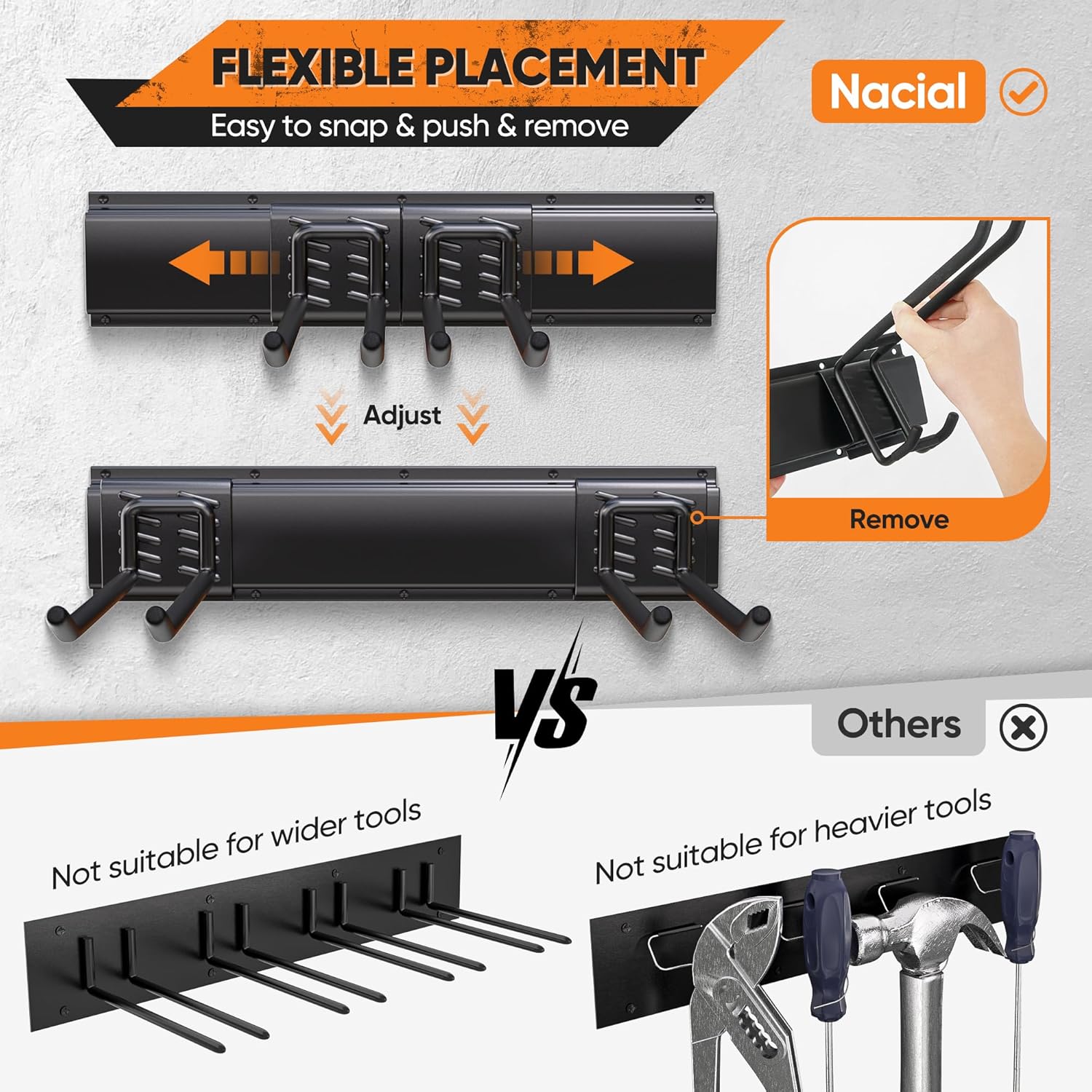 - 48-Inch Adjustable Garage Wall Tool Rack – Nacial Garage Tool Organizer Wall Mount includes 3*16" rails, 8 hooks, and 2 extension cord storage straps. The 48-inch wall-mounted rack allows for flexible tool organization, with hooks that snap onto the rail and can be easily repositioned to accommodate tools of all sizes. Ideal for your garage, utility room, workshop, or basement. Elevate Your Organization—Get Your Nacial Garage Tool Organizer Today!
