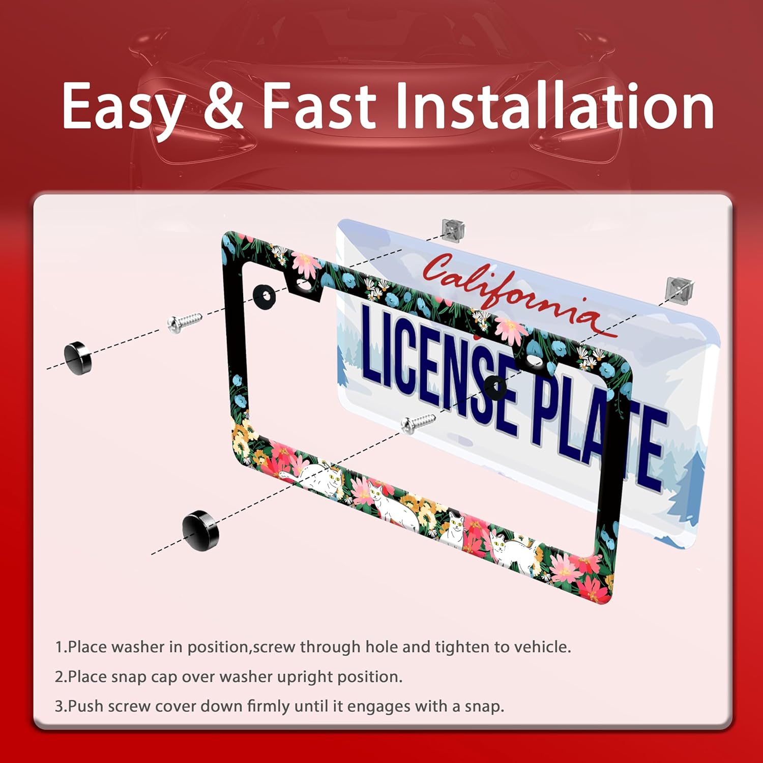 Personalized License Plate Frame Cat Flowers Stainless Steel Accessory Pet License Plate Holder Funny Car Decorative 2 Holes Screws Fits Us Standard License Plates 12.2 X 6.3 in for Men Women