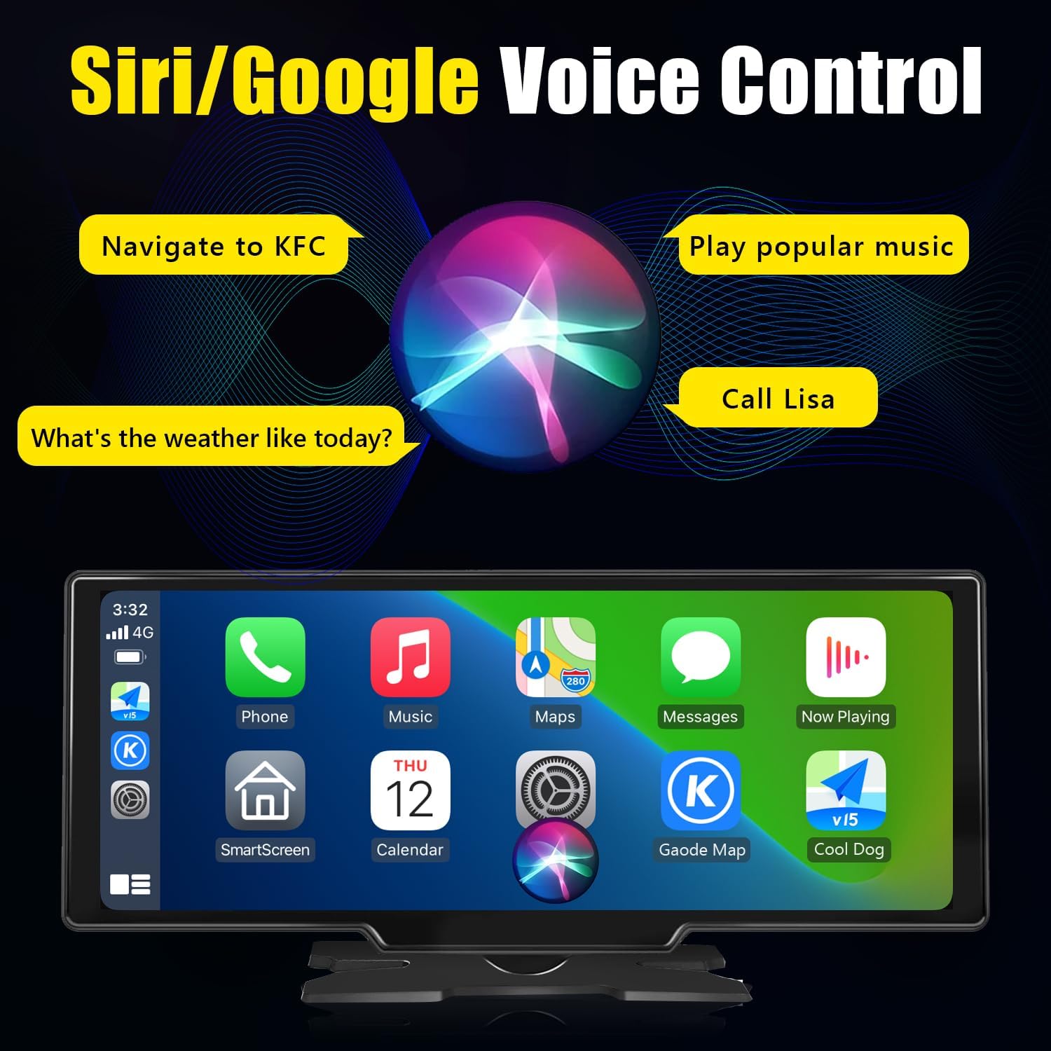 - 【Wireless Carplay & Android Auto】This portable car stereo screen is compatible with Apple Carplay and Android Auto functions.You can simply get into your car and your Smartphone will automatically connect to the car carplay screen; With CarPlay display, you can access your smartphone's apps, maps, music, videos, and other features, as well as use Siri or Google Assistant voice to control the CarPlay screen.