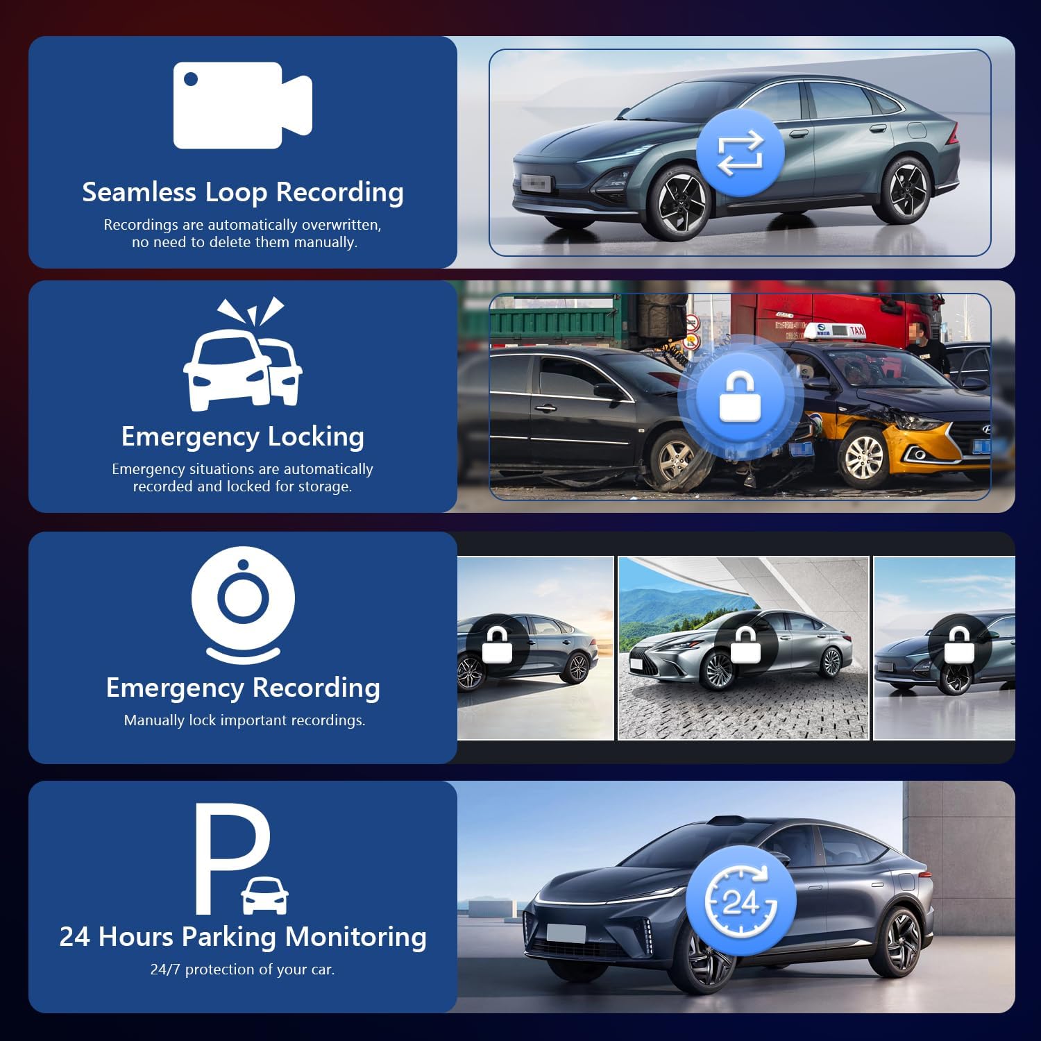 - 【4K Front + Rear 1080P Dual Camera Dash Cam】The car screen equipped with front 4K front camera + 1080P waterproof backup camera, with dual-screen recording capabilities and 170° wide-angle lens, support to night vision and loop recording, giving you a clear and accurate record of your journeys.