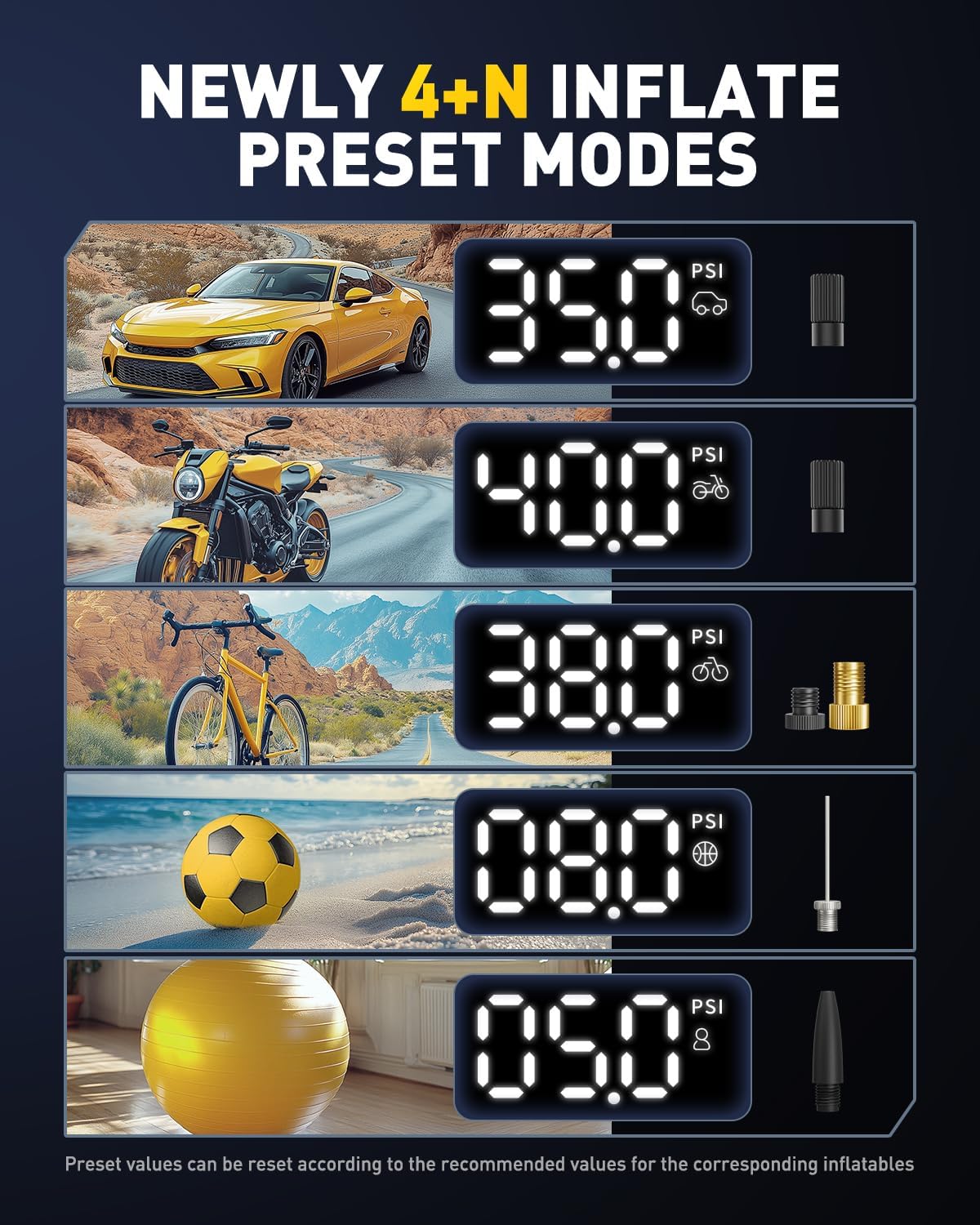 - 【4+N Smart Preset Modes for Any Task】 With 4 preset modes (Car, Motorcycle, Bike, Ball) and a Custom mode, this inflator handles any inflation task effortlessly. Whether you're filling car tires, bike tires, sports equipment, or even pool toys, the AUXITO Tire Inflator is your ultimate all-in-one solution.