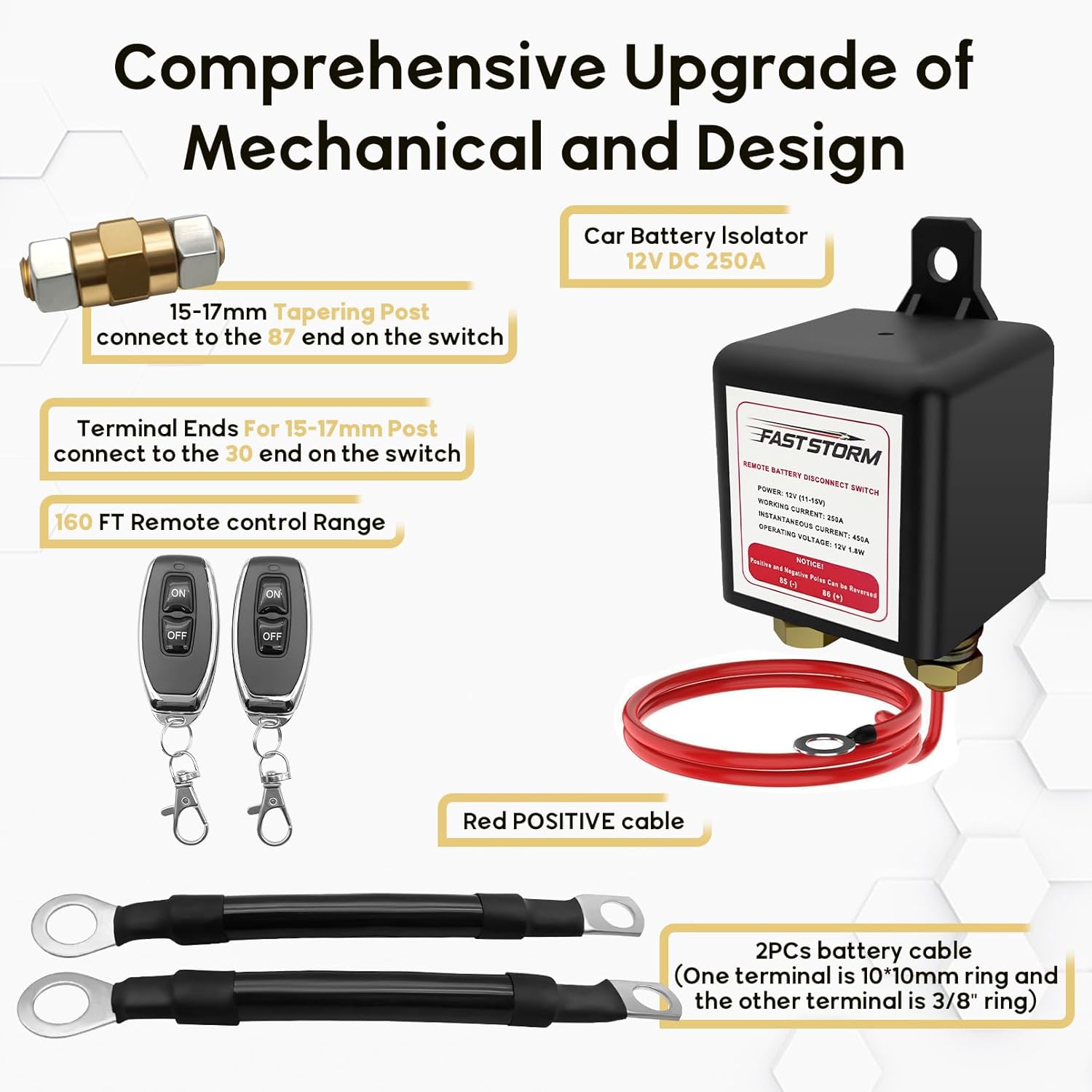 - Wide Applications: Our 250A car battery disconnect switch comes with two paired wireless remote fobs, the remote control can be controlled within 100 meters, This 12v remote control switch is suitable for Car, Truck, Boat, RV, Travel Trailer, Camper, SUV, ATV, UTV, Marine, Van, Agricultural Vehicle Trike Auto Off Road Jeep