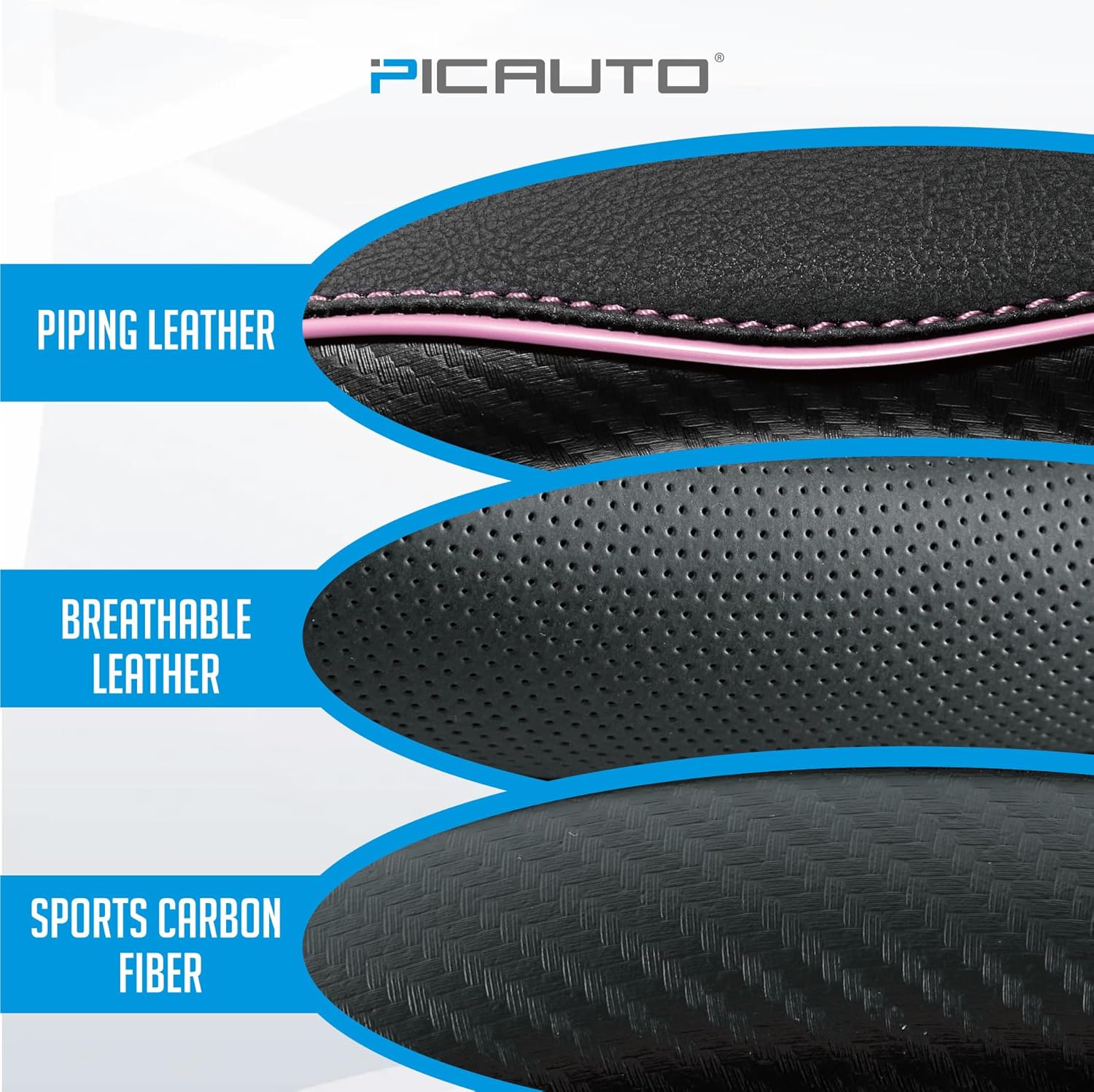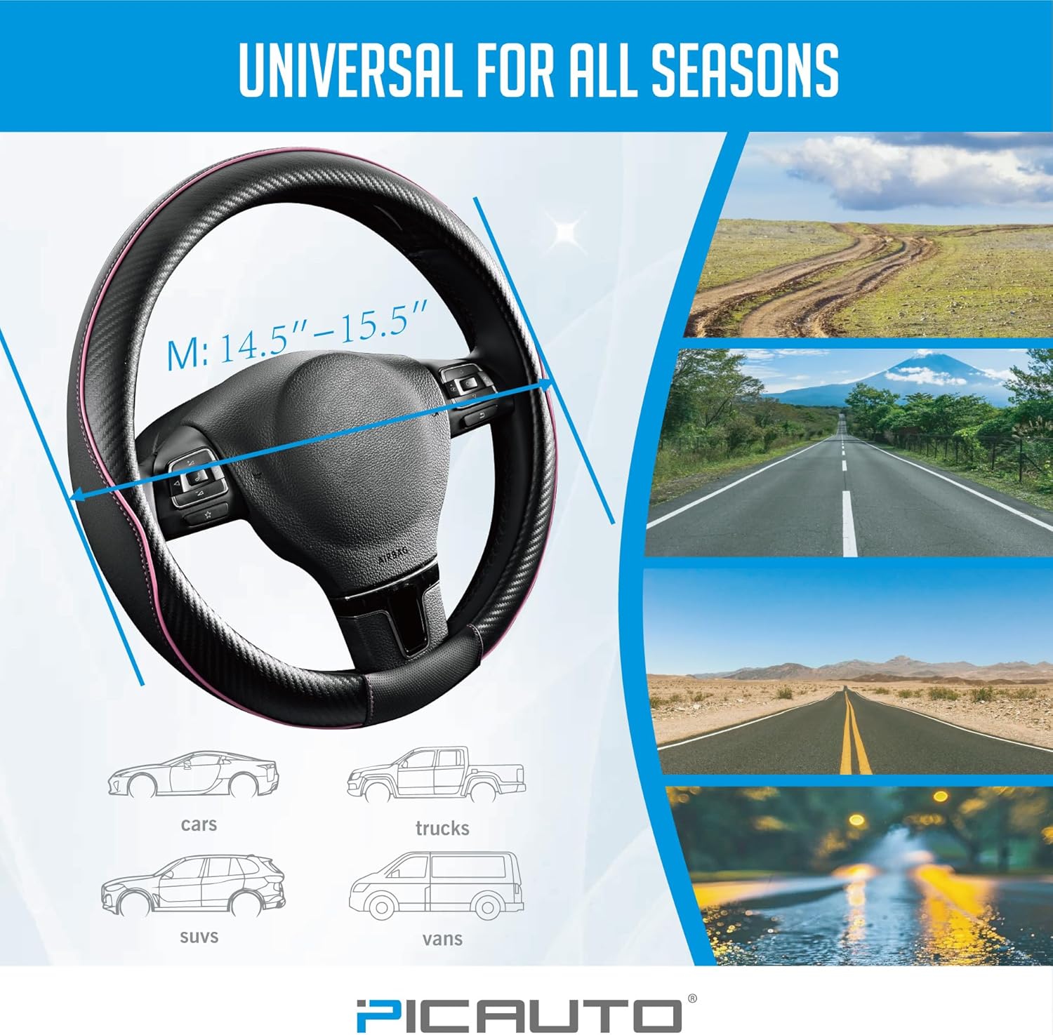 PIC AUTO Steering Wheel Cover, Pink Piping Leather, Sports Carbon Fiber and Super Breathable Leather, Universal 14.5-15.5 Inch Anti-Slip Steering Wheels Accessories for Men & Women