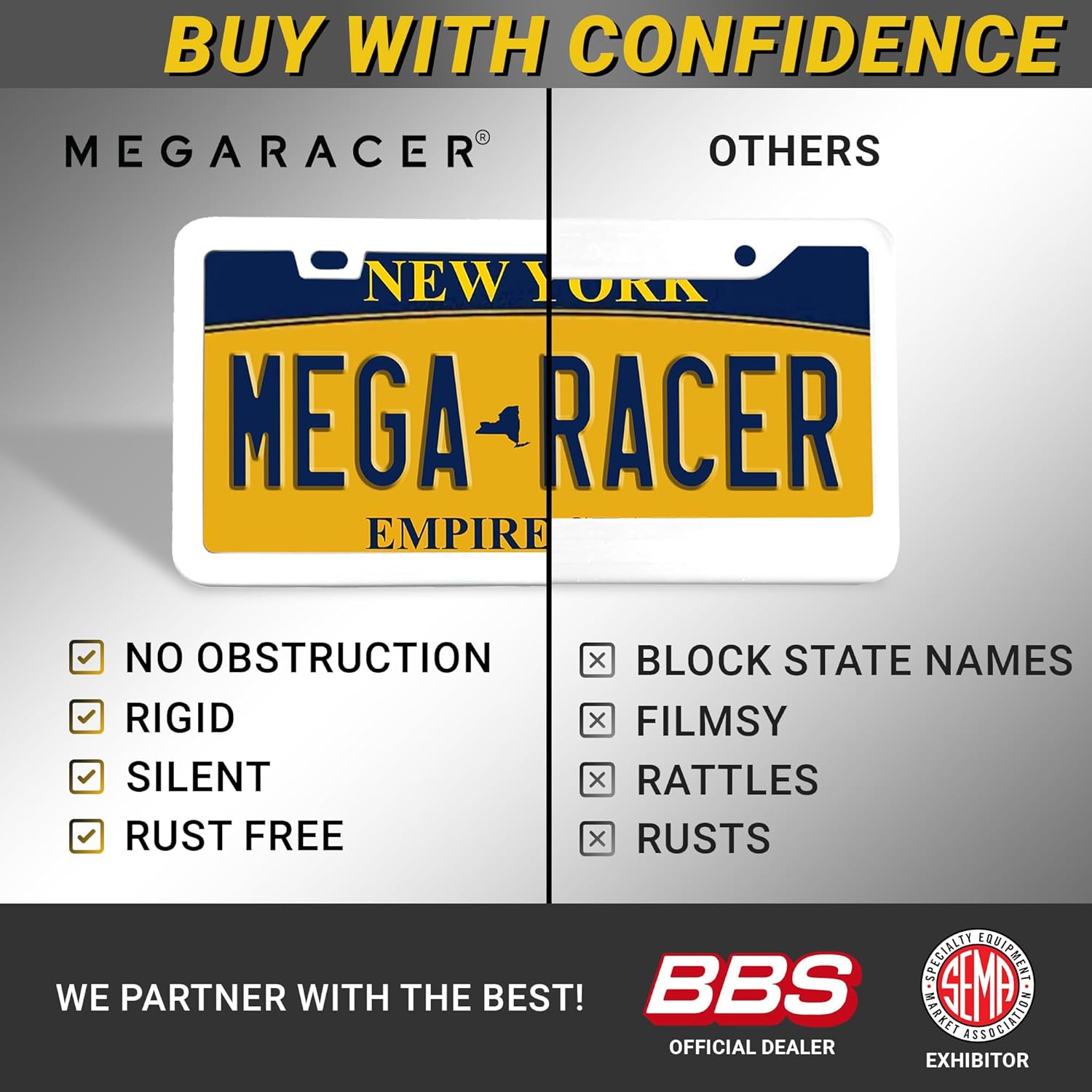 - STRONG DURABLE QUALITY: Our 2 pc License Plate Frame White Holder is made strong to uphold anything from car washes to weather changes. Mega Racer's white license plate frames are RATTLE PROOF and RUST RESISTANT keeping your vehicle paint SCRATCH FREE.