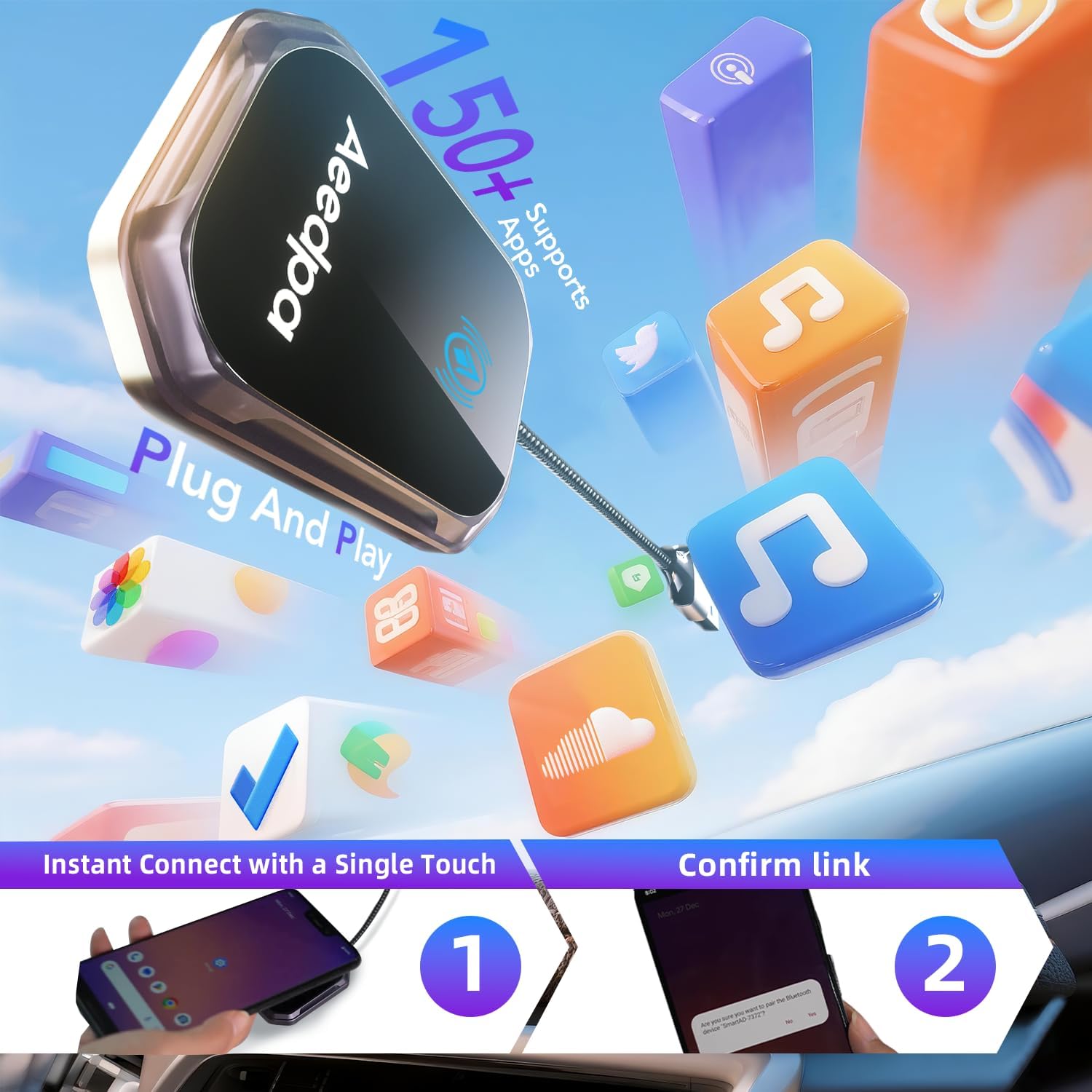 - Easy Setup: Plug-and-play design allows for quick installation—Simply connect the adapter to your car's USB port,turn on Bluetooth and Wi-Fi on your android smartphone, and pair it effortlessly. Touch-to-connect,get connected in minutes
