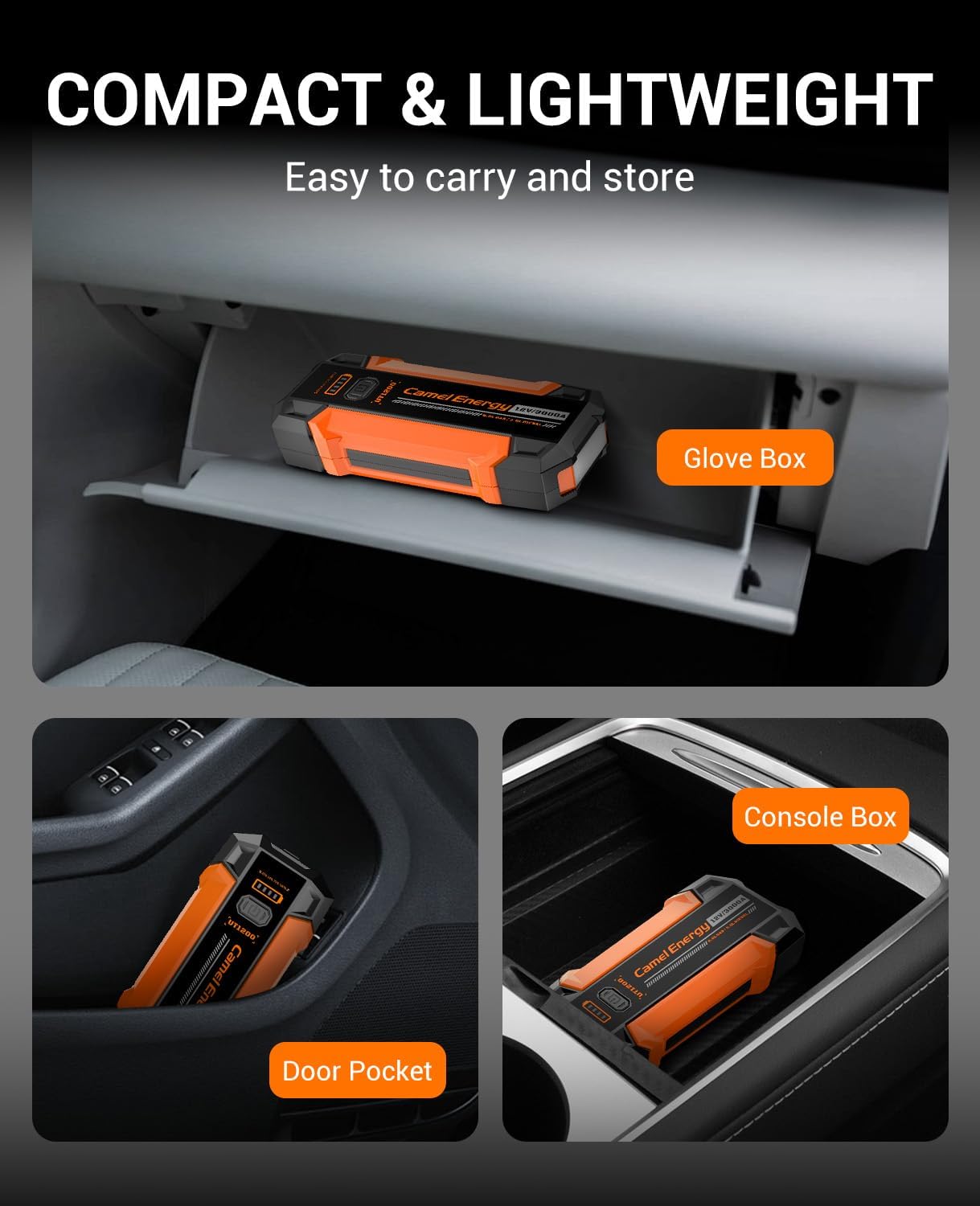 - POWERFUL BATTERY JUMP STARTER: The Camel Energy battery jump starter boasts a peak current of 3000A, enabling it to initiate the start of engines up to 8.0L for both gasoline and diesel vehicles within seconds. It is designed to safely revive a depleted car battery even in extreme temperatures ranging from -4℉ to 140℉, making it suitable for a variety of 12V vehicles, including cars, trucks, motorcycles, boats, yachts, lawnmowers, ATVs, SUVs, snowmobiles, and pickups.