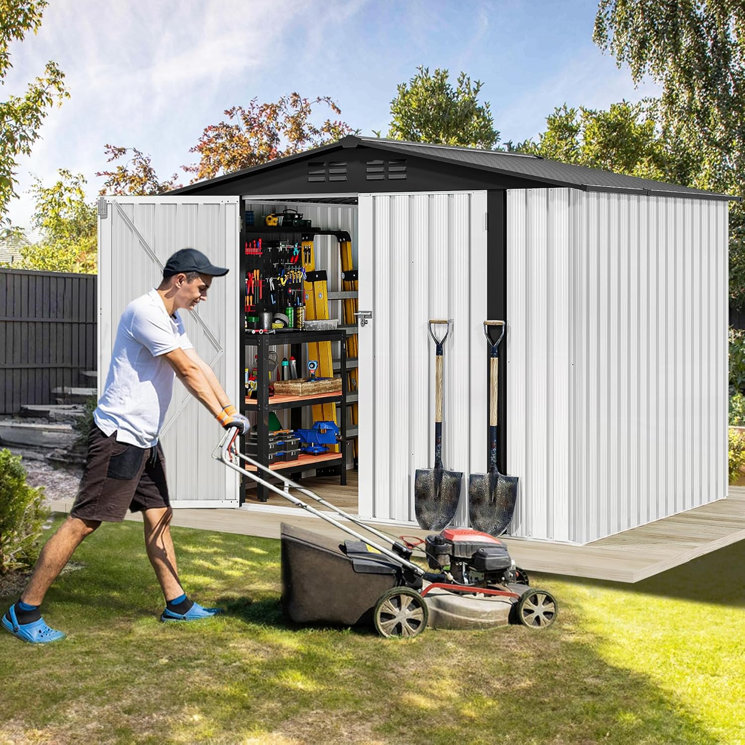 DWVO 8x6ft Metal Outdoor Storage Shed, Waterproof Tool Shed Heavy-Duty Storage Unit with Lockable Door and Vents, Ideal for Bicycles, Tools, Lawnmowers, Backyards, Patios, Lawns - White