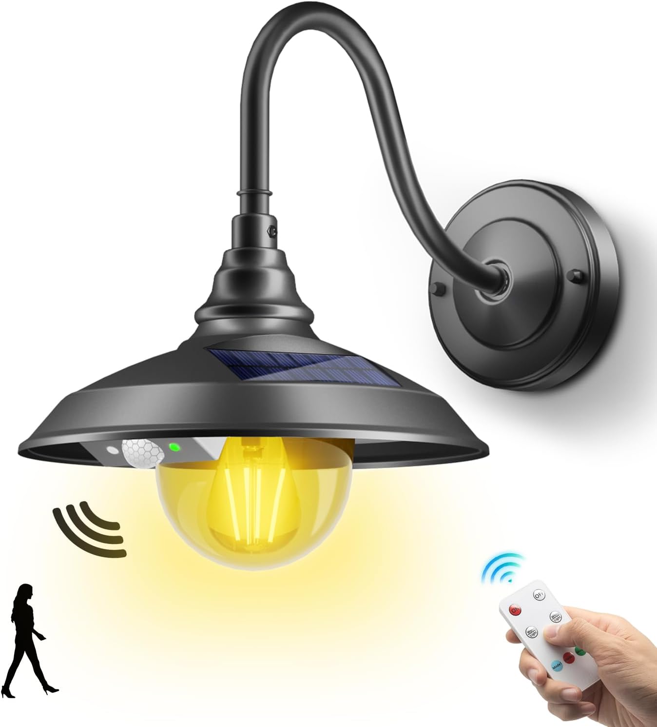 SIEDiNLAR Solar Barn Light Outdoor 3 Modes 2 Lighting, Aluminum Gooseneck Wall Light Vintage Farmhouse Waterproof with Remote & Motion Sensor for Barn Garage Shed Chicken Coop Porch Black (1 Pack)